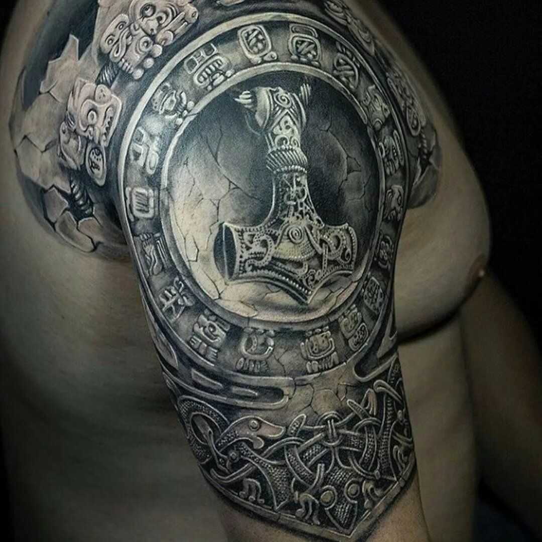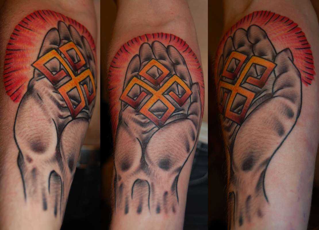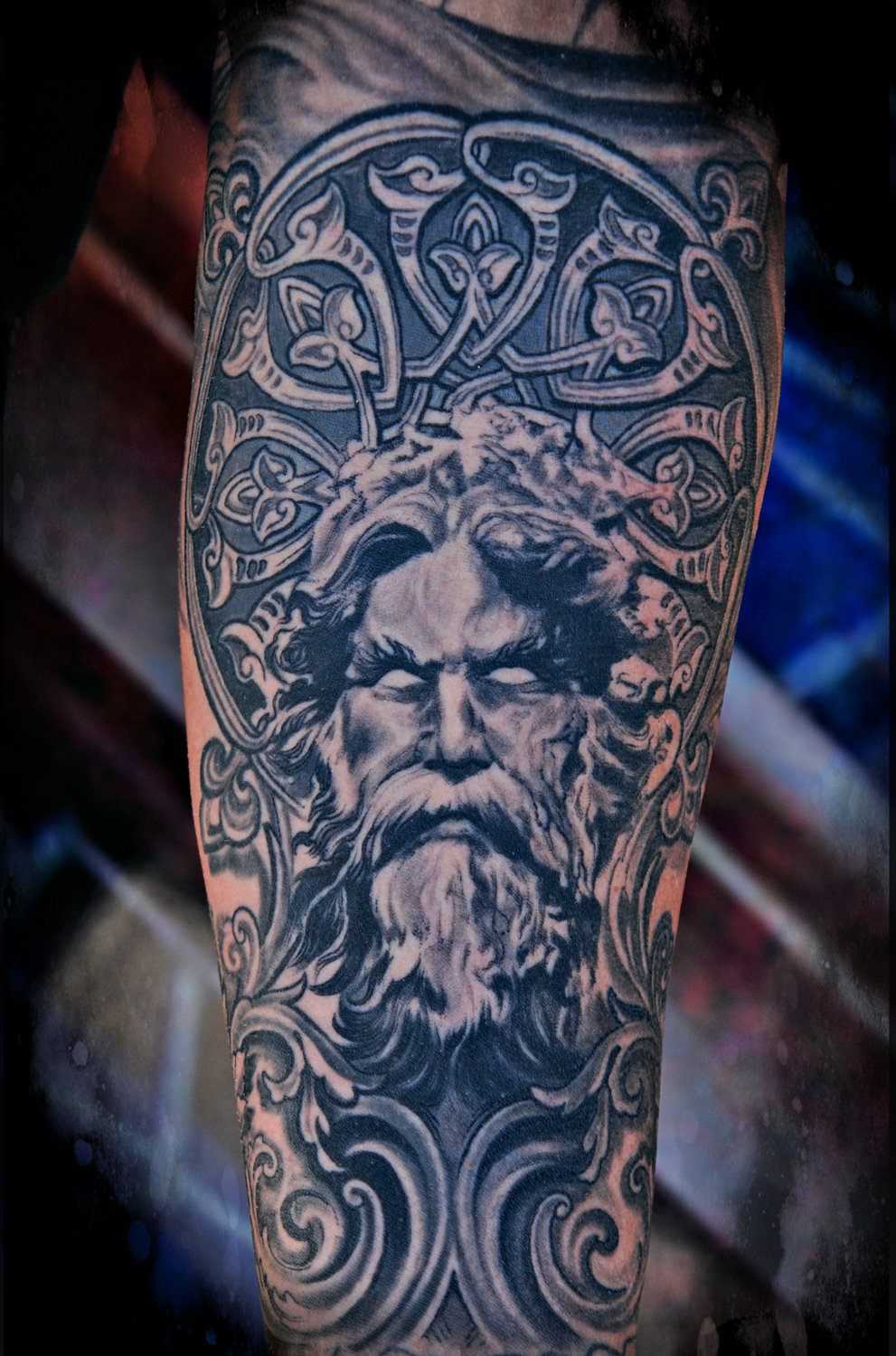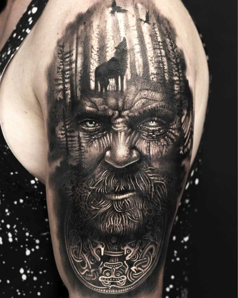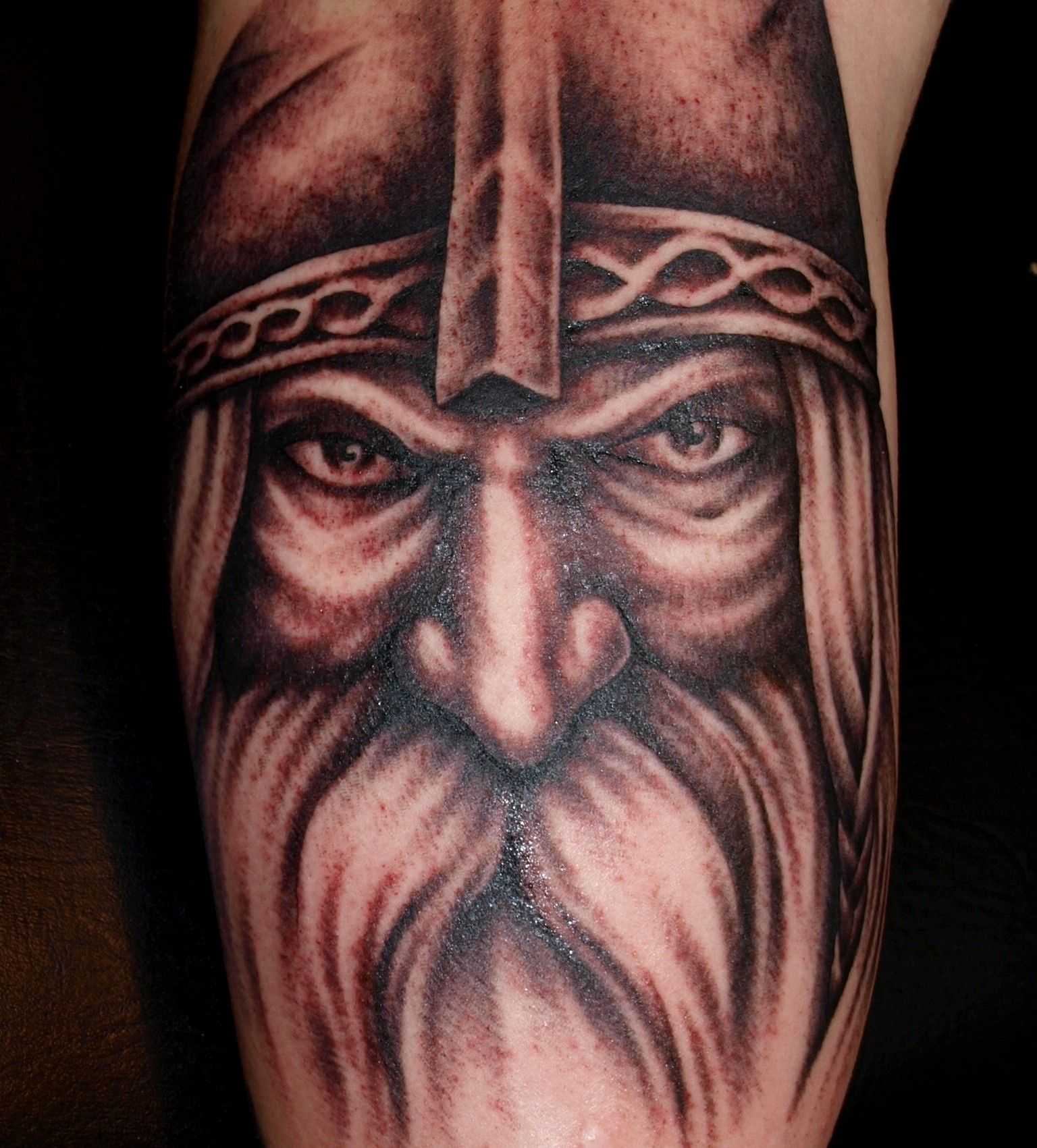 Тату с изображением божества – у славян в древности был большой пантеон богов, напоминающий мотивы скандинавской религии и мифологии. Культура славян и викингов постоянно переплеталась, отсюда появились следующие языческие наколки: