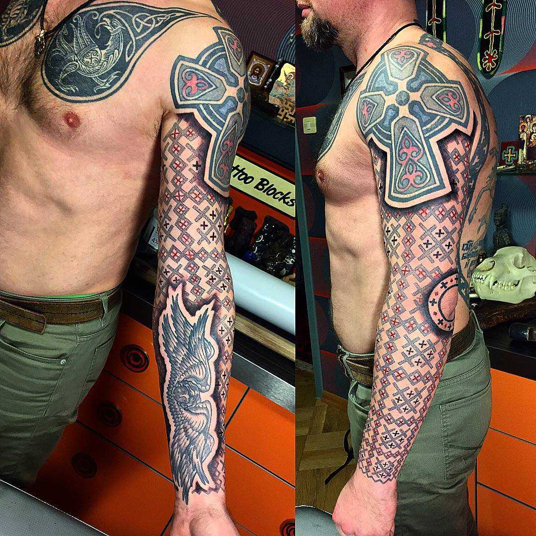 Это уже татуировки в «русском» стиле, нежели в славянском. Встречаются довольно редко, но и создать из родных узоров красоту вполне реально.
