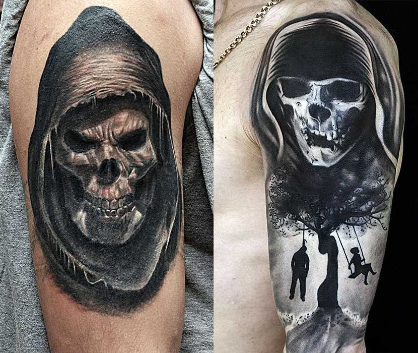 Черно-белая тату тигра у парня на руке Черно-белая тату льва на бицепсе у мужчины Черно-белая тату медведя рвущего кожу Черно-белая черепа в шлеме