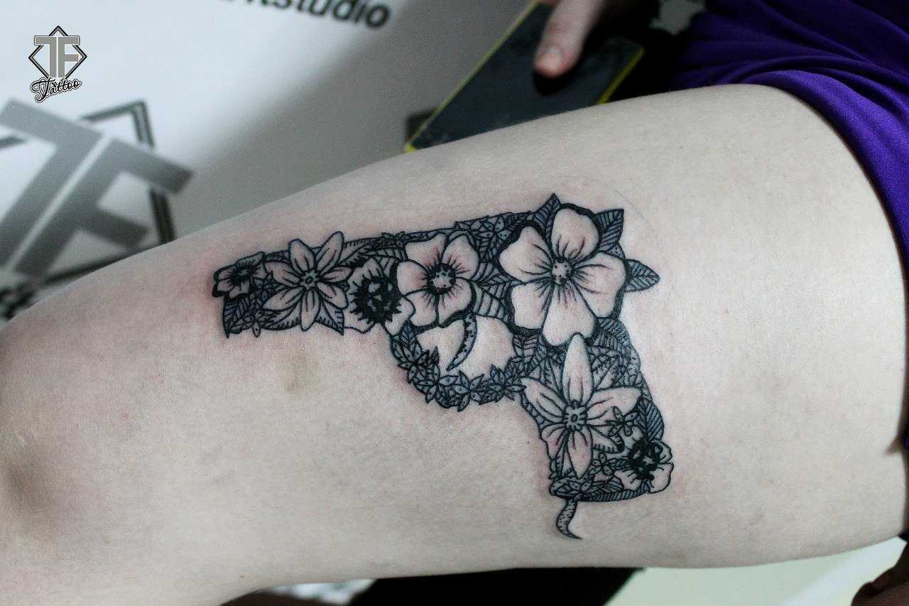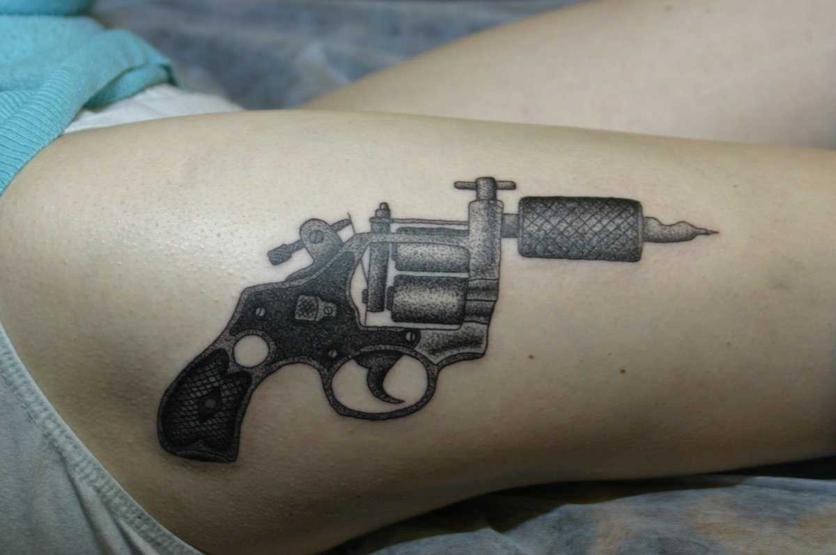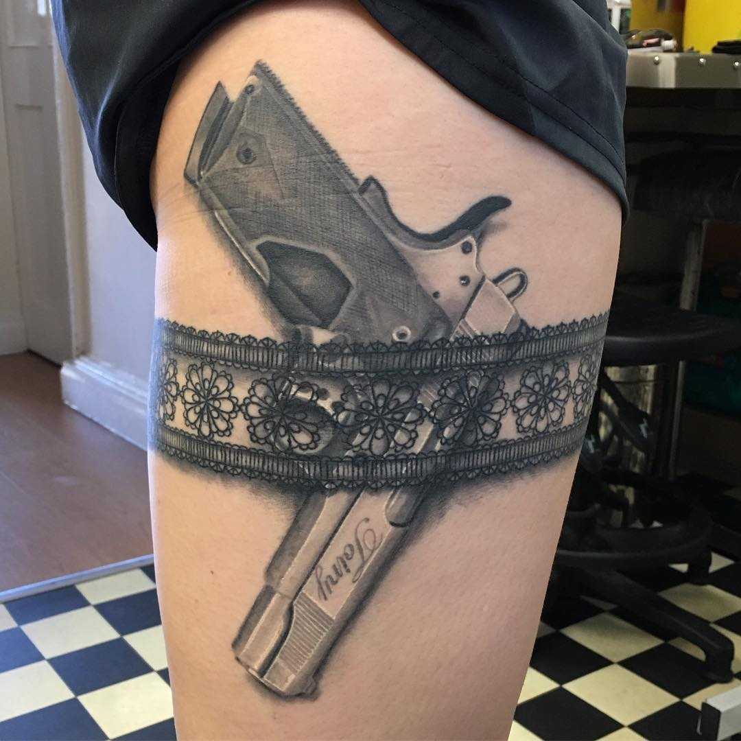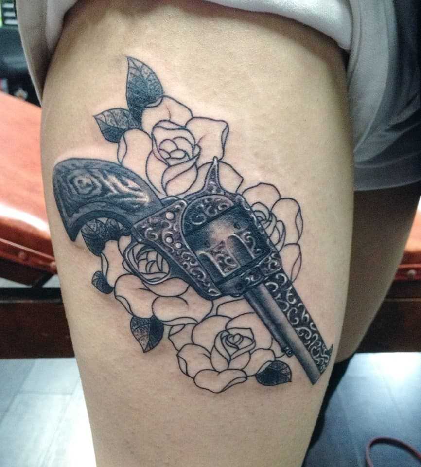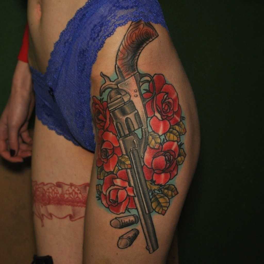 Большая объемная поверхность бедра позволяет наносить изображения любой формы и размеров. К тому же, тату в виде пистолета можно интересно «обыграть», добавив несколько красивых элементов по своему желанию.