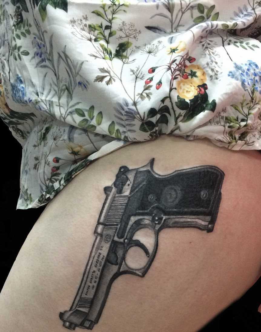 Татуировка пистолет – это способ показать, что под внешней красотой и милой внешностью находится самостоятельная и независимая личность.