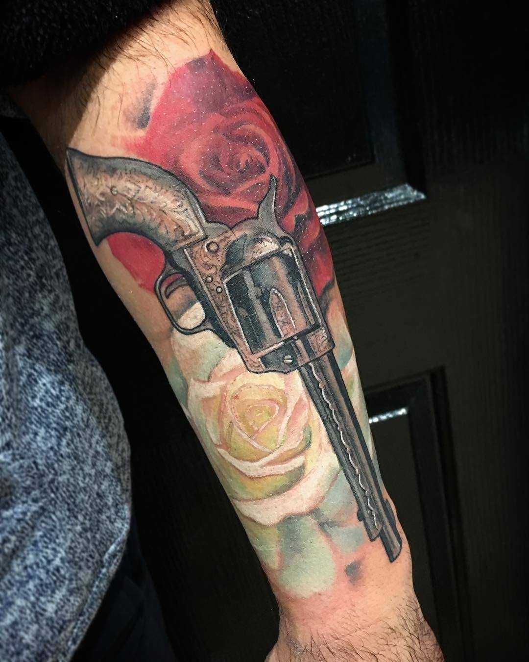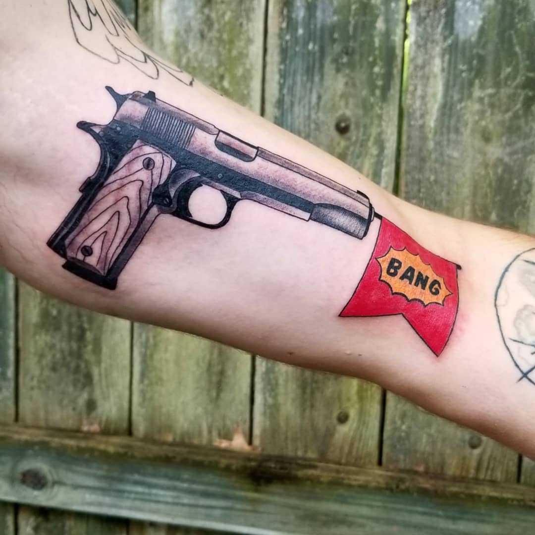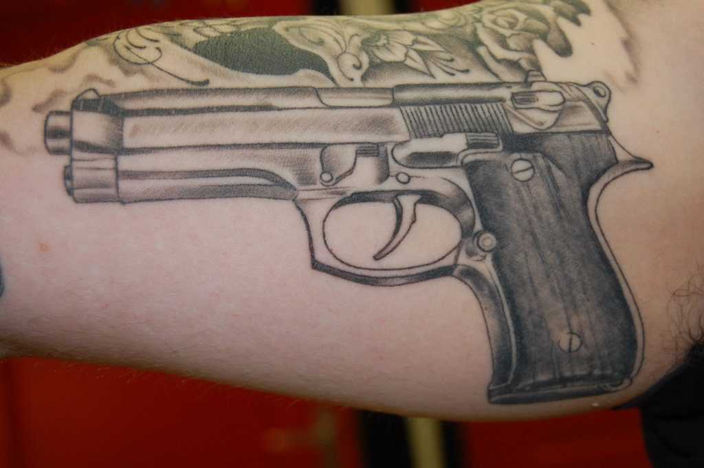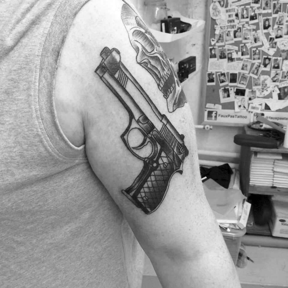 Вариации пистолета набивают на своё тело в память о боевых действиях солдаты или люди, чья профессия непосредственно связана с ношением оружия. А ещё, подобные нательные украшения могут подчёркивать более личные качества, например, верность или преданность.