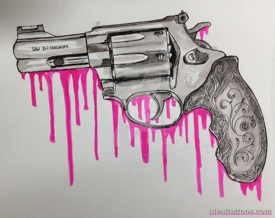 Татуировка с изображением пистолета для девушек имеет следующие значения: риск, опасность, легкомыслие, смелость и независимость. Также подобная татуировка очень часто имеет сексуальный подтекст, например, если оружие окружено сердечками или атласными лентами, то оно намекает на то, что девушка готова к интимным экспериментам или опасным связям. А вот изображение револьвера свидетельствует о том, что девушка хочет защитить себя от окружающих и их агрессии. Цветовая гамма на значение не влияет, но обычно девушки выбирают яркие оттенки.