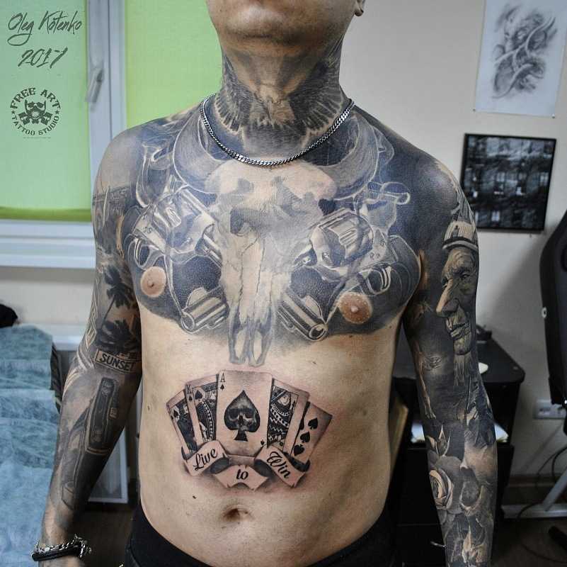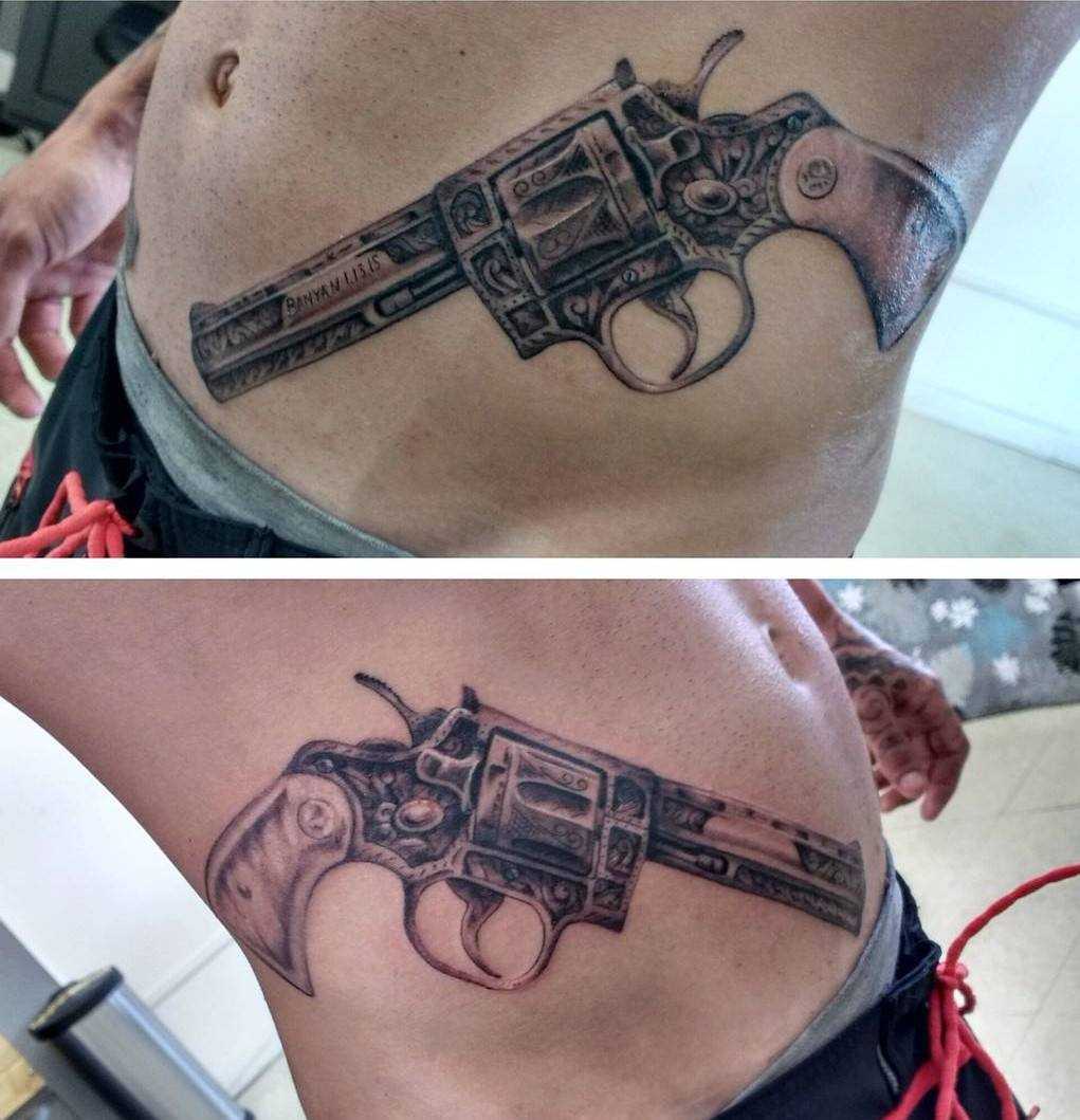 Конечный результат будет смотреться особенно эффектно, если татуировка револьвер на животе выполнена в реалистичной стилистике. На этом же участке тела встречаются и варианты с симметричным расположением двух пистолетов.