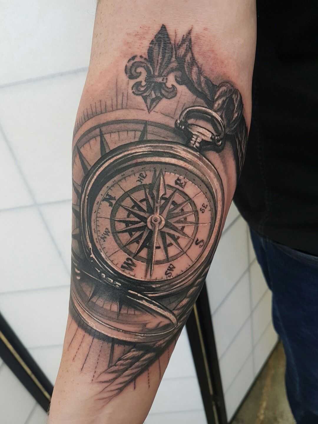 Самое популярное место для мужских тату с компасом — рука. Кто-то соединяет несколько схожих символов (карта, море, корабль) с компасом и делает большое тату-рукав. Некоторые выбирают компас с розой ветров в стиле блэкворк