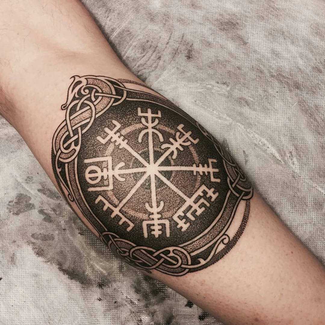 Компас, выполненный в скандинавском руническом виде, состоит из круга, включающего в себе кельтские руны. Такая татуировка считается очень древним и магическим талисманом. Данный компас поможет почувствовать свой внутренний голос и следовать за ним. Также тату не позволит потеряться на жизненном пути. Некоторые считают, что такая татуировка исполняет роль амулета.
