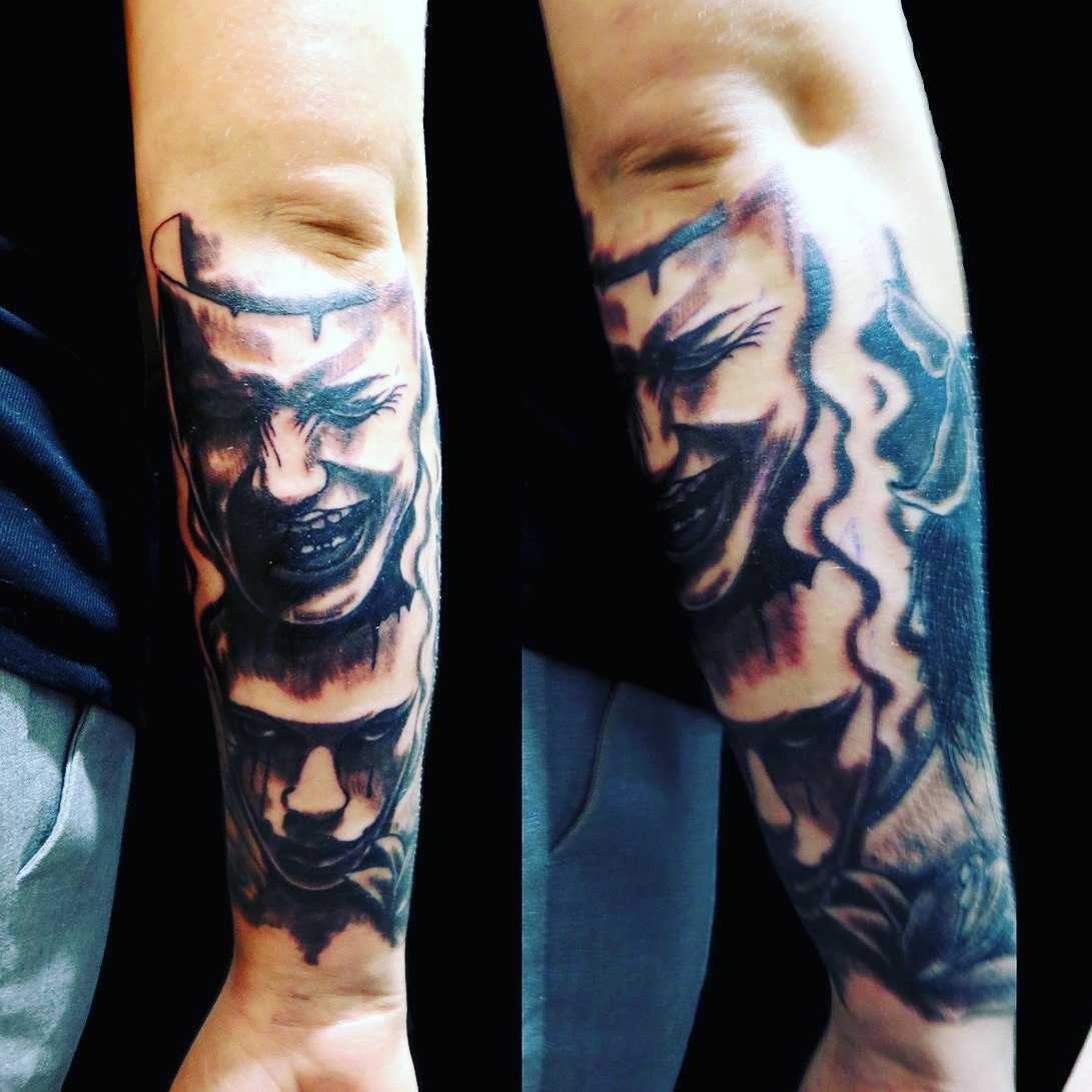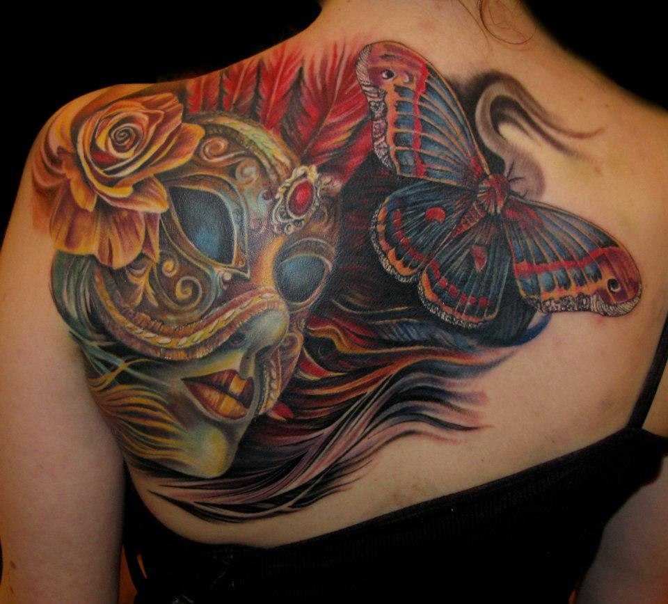 Театральные маски появились еще во времена древних римлян. Они использовались для театральных постановок. Существовало два вида масок – веселая (комическая) и грустная (трагическая). Изображая такие маски на своем теле, ее обладатель передает свое отношение к жизни или же, наоборот, скрывает свое истинное состояние. Тату с изображением масок для карнавала, скрывающих только глаза, замечательно смотрится на любом участке тела. Мужчины отдают предпочтение наносить тату маска на плечо или грудь. А вот девушки предпочитают такую татуировку наносить на бедро, живот или запястье.