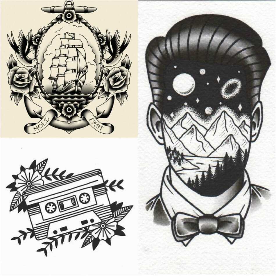 Эскизы тату в стиле олдскул выполняются в простой манере с минимумом деталей. Если изображается одежда, на ней обязательно прорисовывают грубые складки. В целом рисунки этого направления можно сравнить с комиксами 30-х годов.