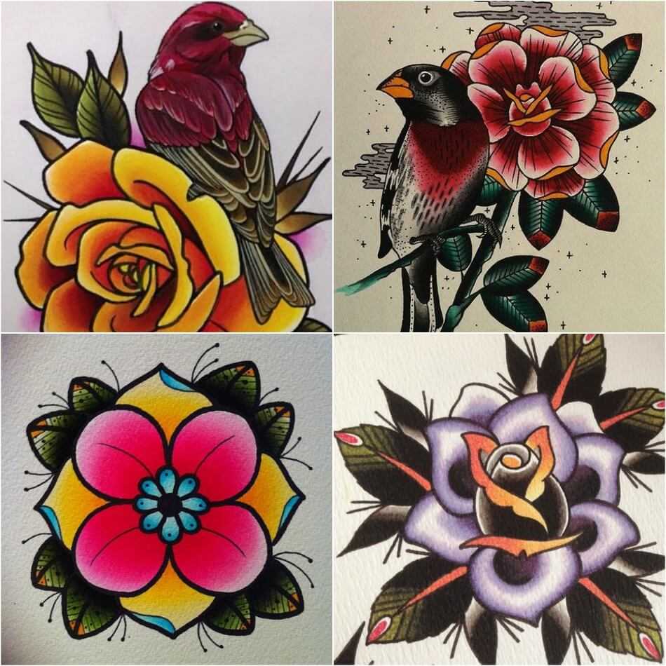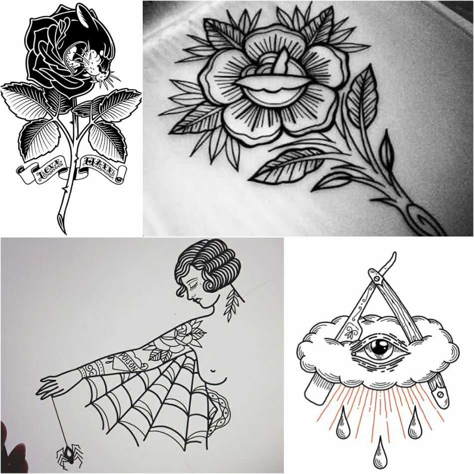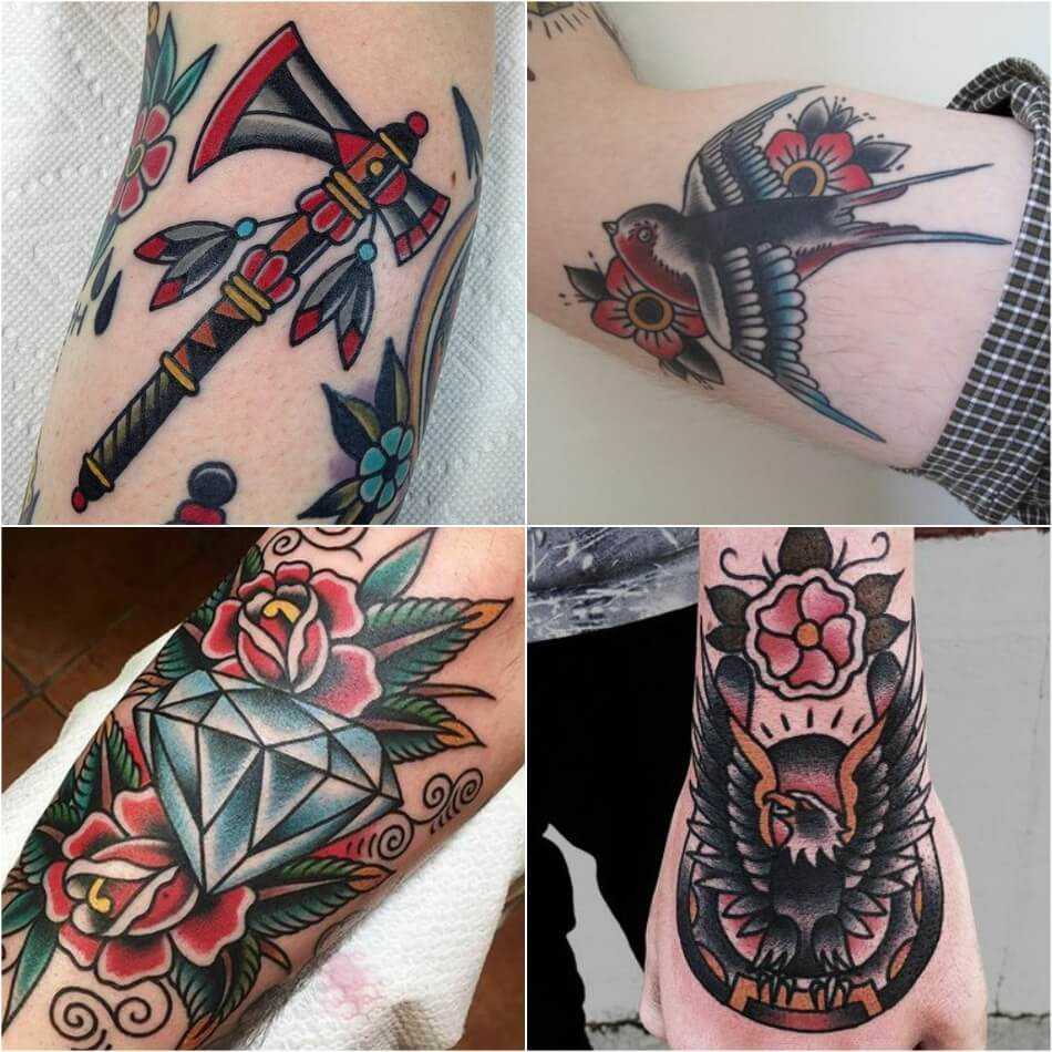 Изображения, созданные в данной стилистике, довольно сложно объединить в группы. Стоит выделить наиболее яркие объекты направления: Розы. Символ искренней и неподкупной любви. Одинаково уместна для мужских и женских тату. Красные розы — символ страсти и всепоглощающего чувства. В древние времена нанесение белой розы без шипов имело особенный характер. Таким цветком одаривали чистых и невинных девушек, никто другой не имел права использовать данное изображение для украшения своего тела. Сердца. Глубокий символ, который вмещает в себя и откровенно женские слабости, и мужскую силу. Этот символ, изображенный на груди, олицетворяет преданность семье и самым близким. Ласточки. Олицетворяют удачу и счастье. Это легкий символ, свидетельствовал об окончании путешествия и возвращении на родную землю у моряков. Сегодня, конечно, это более приземленная интерпретация, которая заключается в преданности и душевной чистоте. Якорь. Символ надежды и веры в то, что никакие преграды и жизненные трудности не способны сломать и сдвинуть с места. Изображение больше популярно у мужчин, чем у прекрасных дам. Выбирая для нанесения портреты своих близких, очень многие не желают носить на своем теле изображение в духе реализма. Они отдают предпочтение олдскульному направлению, считая его более близким и понятным исключительно для себя. Каждый мечтает заполучить в свой штат мастера, который в совершенстве владеет данным стилем.