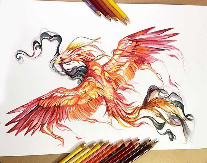 Как и все татуировки тема птицы Феникса делится на монохромные черные и цветные варианты. В цветных работах его принято изображать в огненных красках – доминирующие желтый с красным против контрастного черного. В некоторых стилях для эффекта пламени темные контуры не используются.