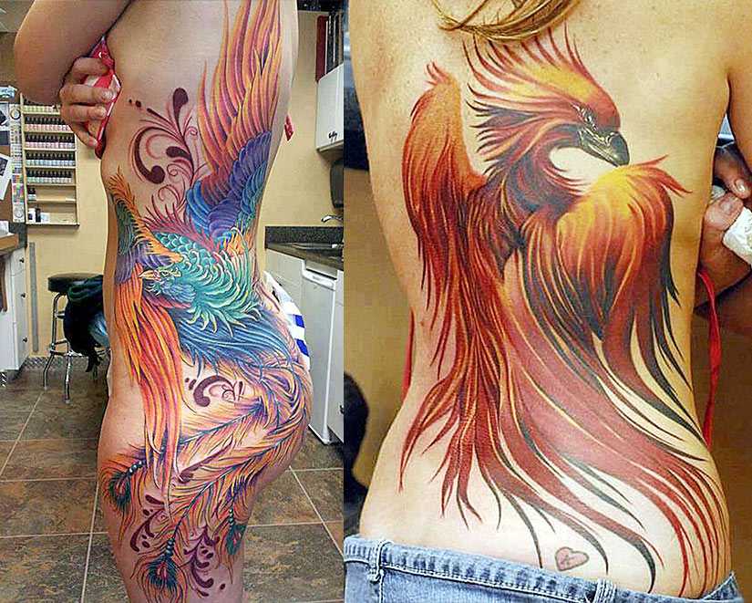 Татуировка феникс для девушек, как символ женственности, является очень популярной. Она может располагаться в любом месте, может быть выполненной в любом стиле и быть любого размера. Всё зависит от фантазии.