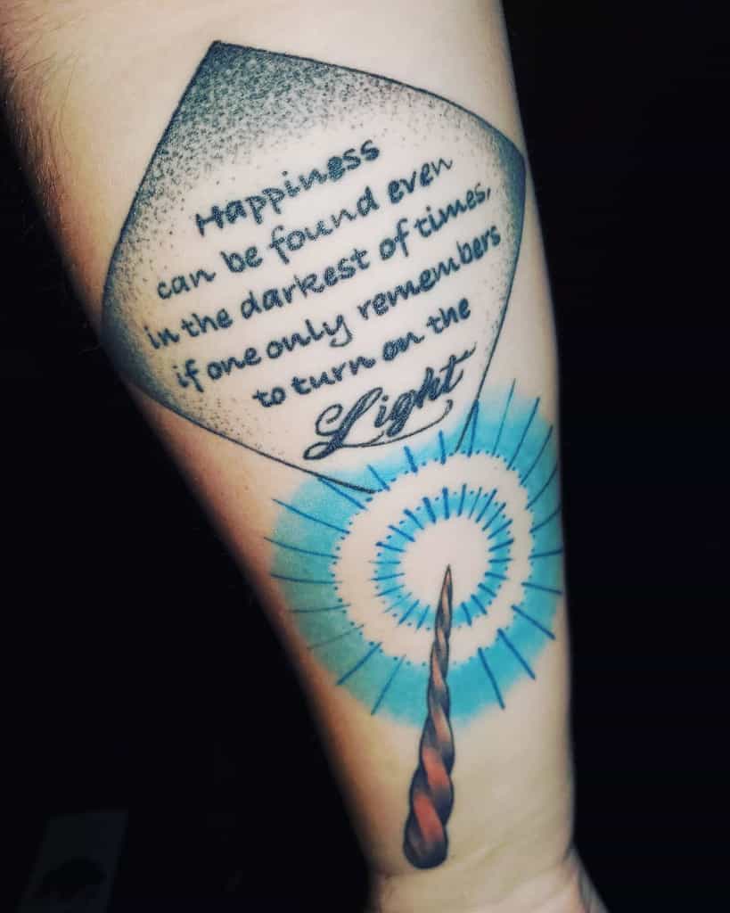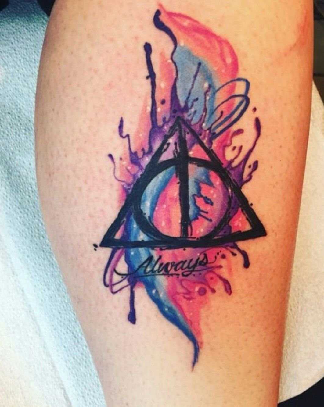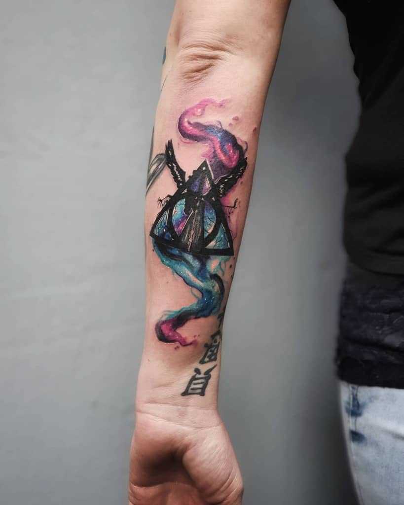 Watercolor tattoos fit many source images from Harry Potter, whether it’s supporting the black ink of the lightning bolt scar and Harry’s glasses, or ore stylized versions of the Golden Snitch and Deathly Hallows.