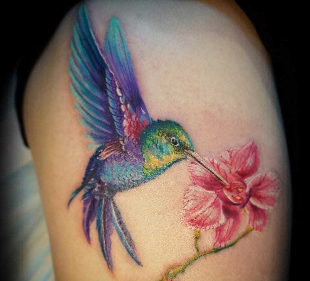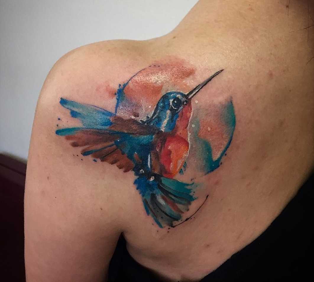 Среди самых популярных стилей на тату колибри акварель занимает первое место. Мягкие краски и переходы дают простор для фантазии.