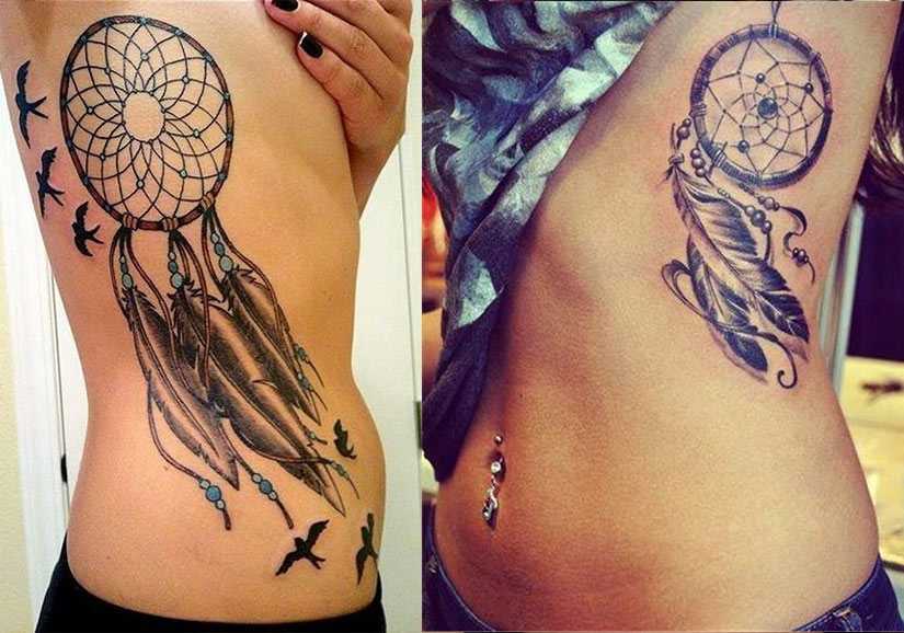 На втором месте популярных мест нанесения тату — ребра. Тут дизайн уже менее объемный, но очень интересный. Если проявить фантазию, то получиться весьма оригинальная и необычная идея для тату. Можно отметить Ловец снов в образе подковы вместо деревянного обода. Это позволит не только защитить обладательницу от дурного влияния и негатива, но и будет притягивать удачу.