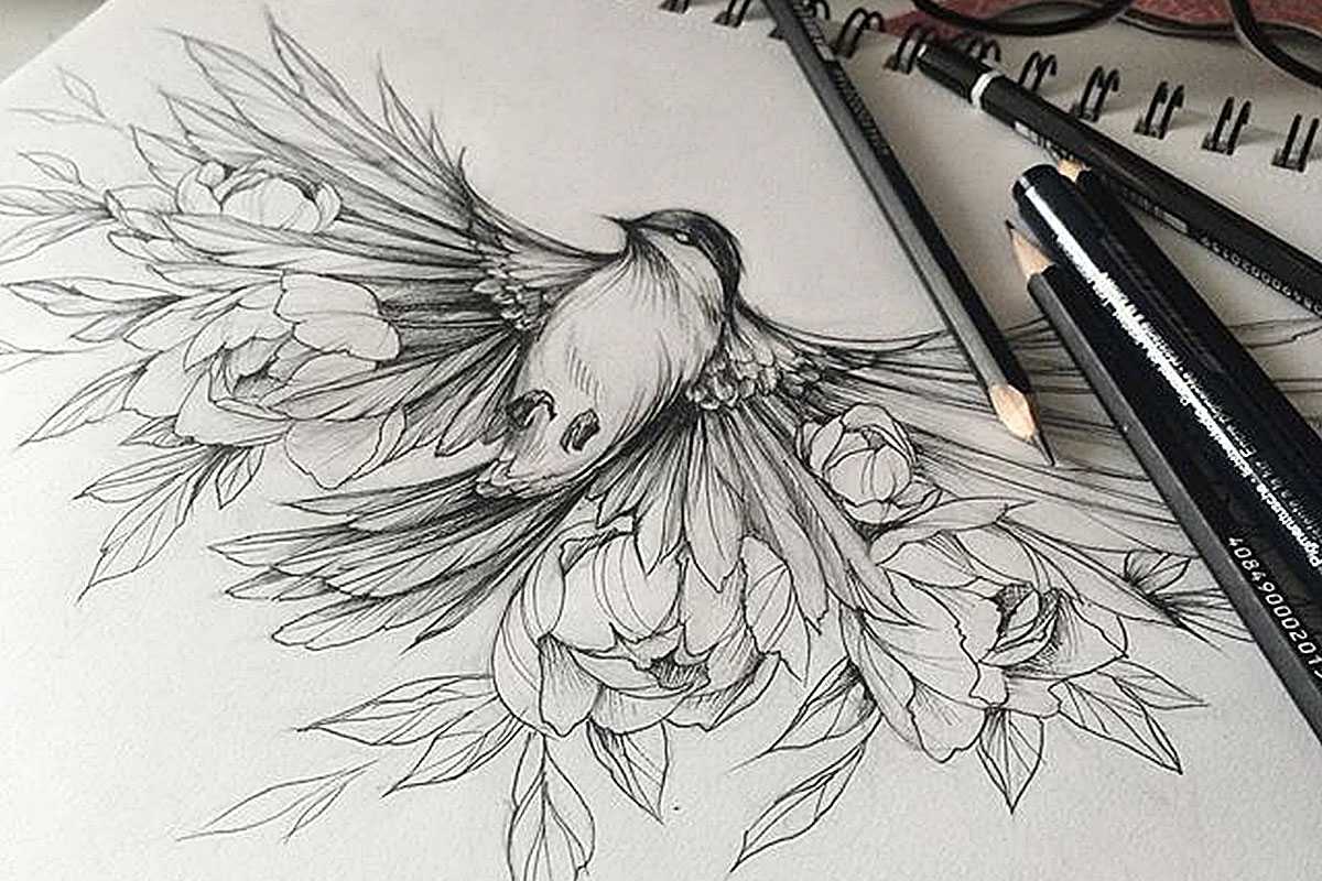 Женский эскиз птицы с цветами