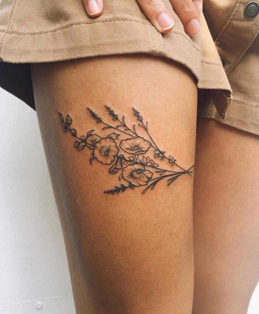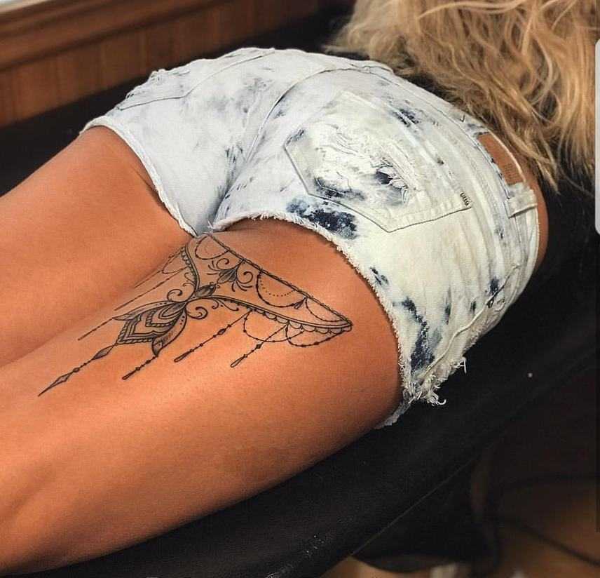 - Внутреннее бедро является идеальным местом для небольшого рисунка. Здесь будет немного больно, так как кожа становится более чувствительной. Люди выбирают это место для интимных эскизов.