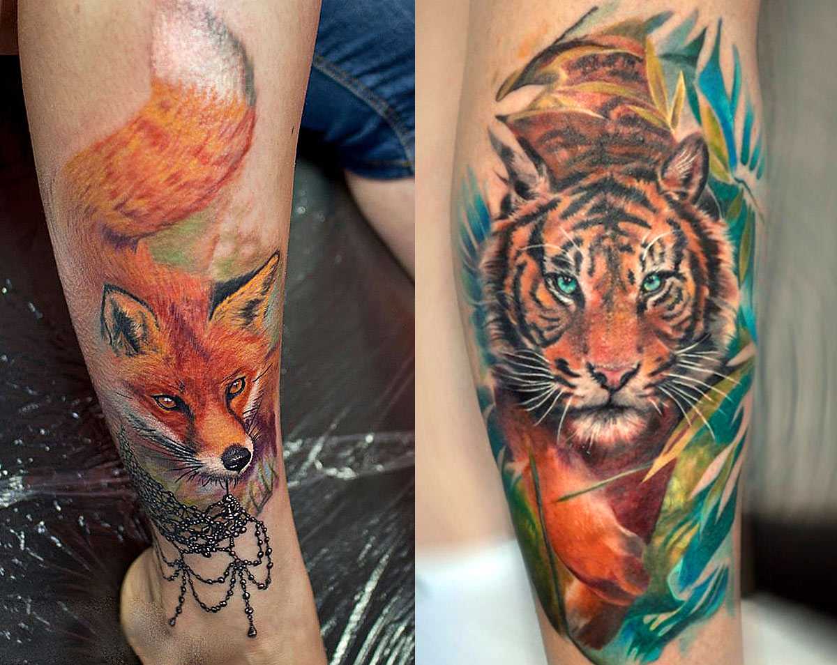 На фото слева женская тату лисы и мужская в правой части с крадущимся тигром