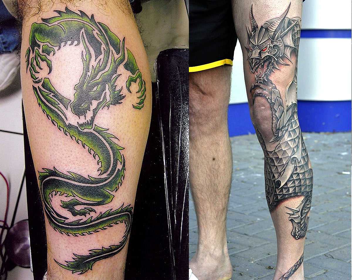 Драконы, вертикальный вдоль голени и с права тату вокруг голени