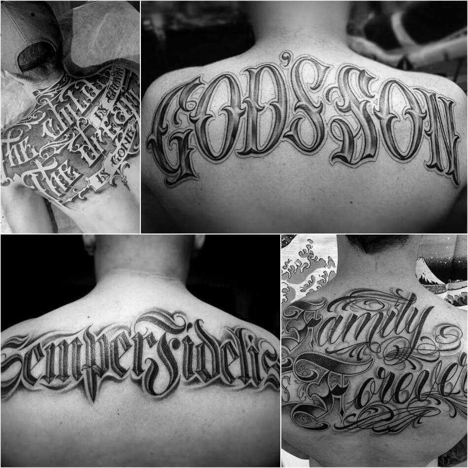 Надпись тату на спине может быть отдельным элементом, либо дополнять какой-то рисунок. Текст может быть любым, на каком угодно языке – русском, латыни, английском, итальянском, немецком. Также используются элементы иероглифического письма (японского, корейского, китайского и т.д.).