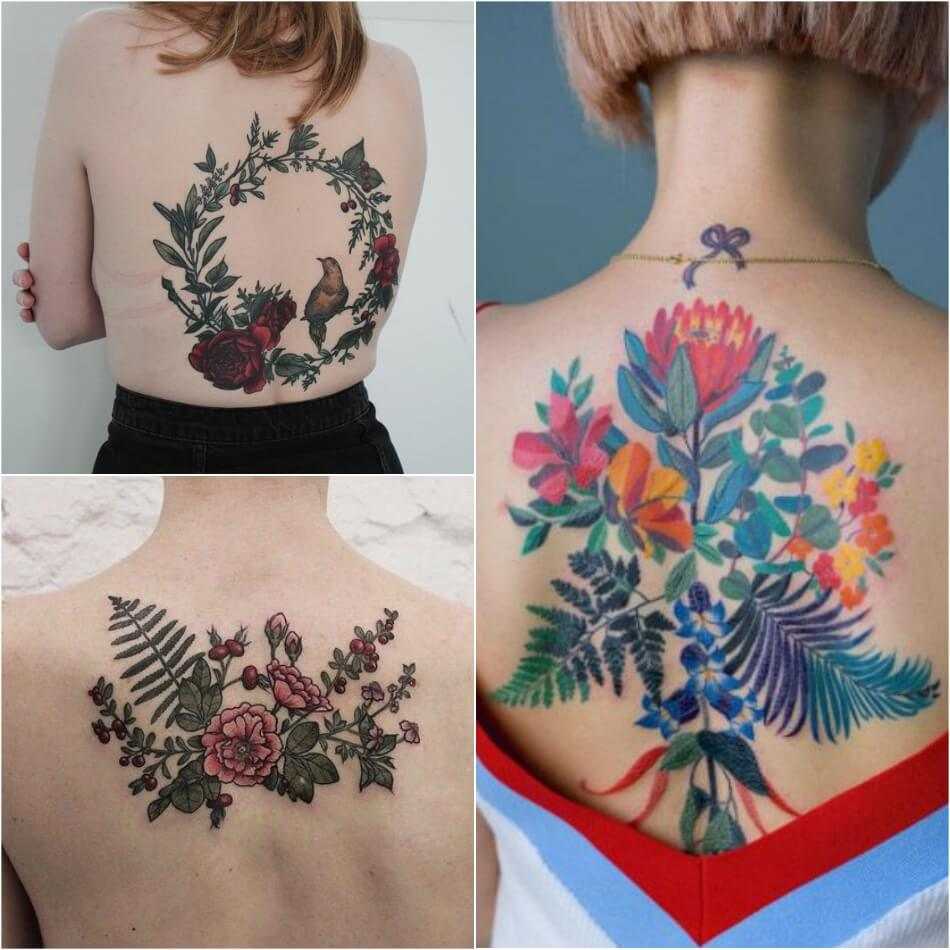 Татуировка цветов. Данная тематика является одной из самых востребованных среди лиц женского пола. Чаще всего можно наблюдать определенный вид цветка на всю спину либо вдоль позвоночника, который в этом случае напоминает чем-то стебель. Лучше всего наносить данный элемент акварельным стилем, так как у мастеров получается добиться непревзойденного стиля и эстетичного вида, так можно легко подчеркнуть индивидуальность каждого владельца.
