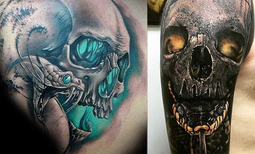 Те же любители поттерианы, что всегда были на стороне тёмного лорда, чьё имя нельзя произносить вслух, предпочитают заказывать символ противников Поттера и его друзей. Сегодня в мире есть немало людей, на коже которых можно найти тату пожирателей смерти – приспешников главного злодея. Он представляет собой череп, изо рта которого вылезает огромная змея.