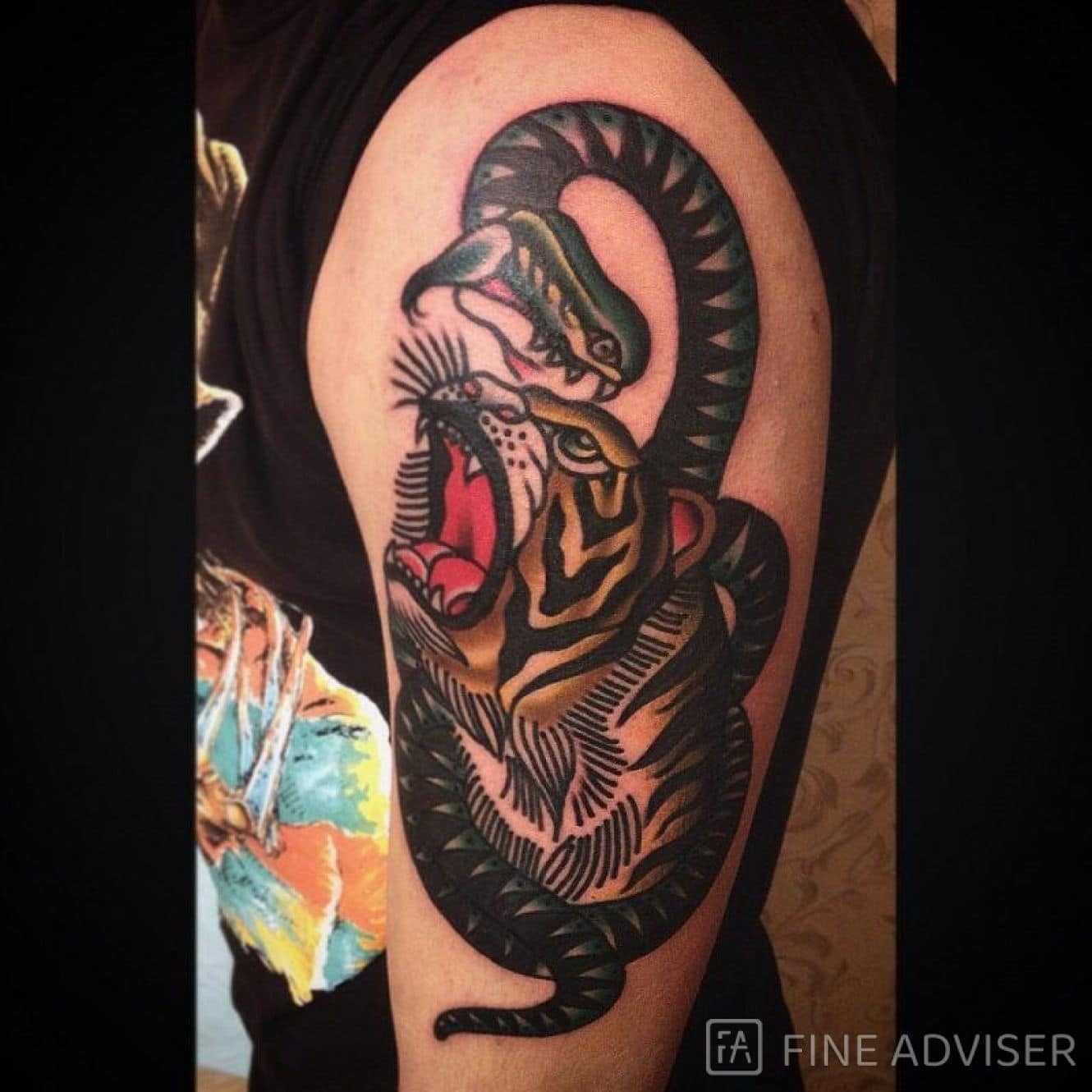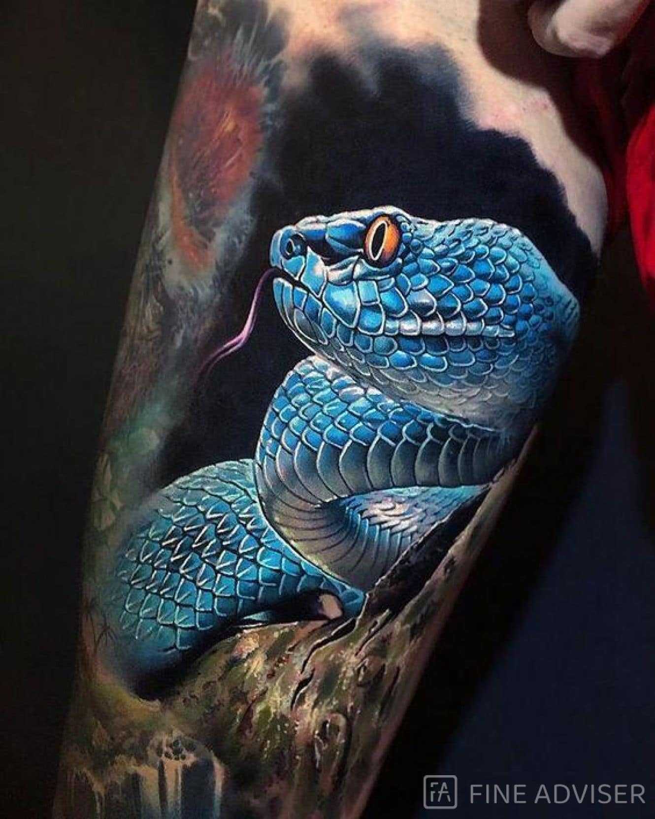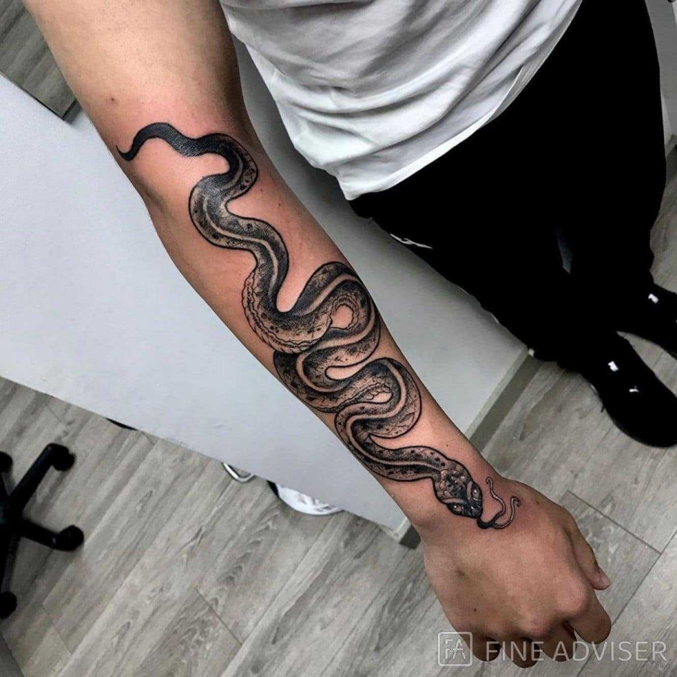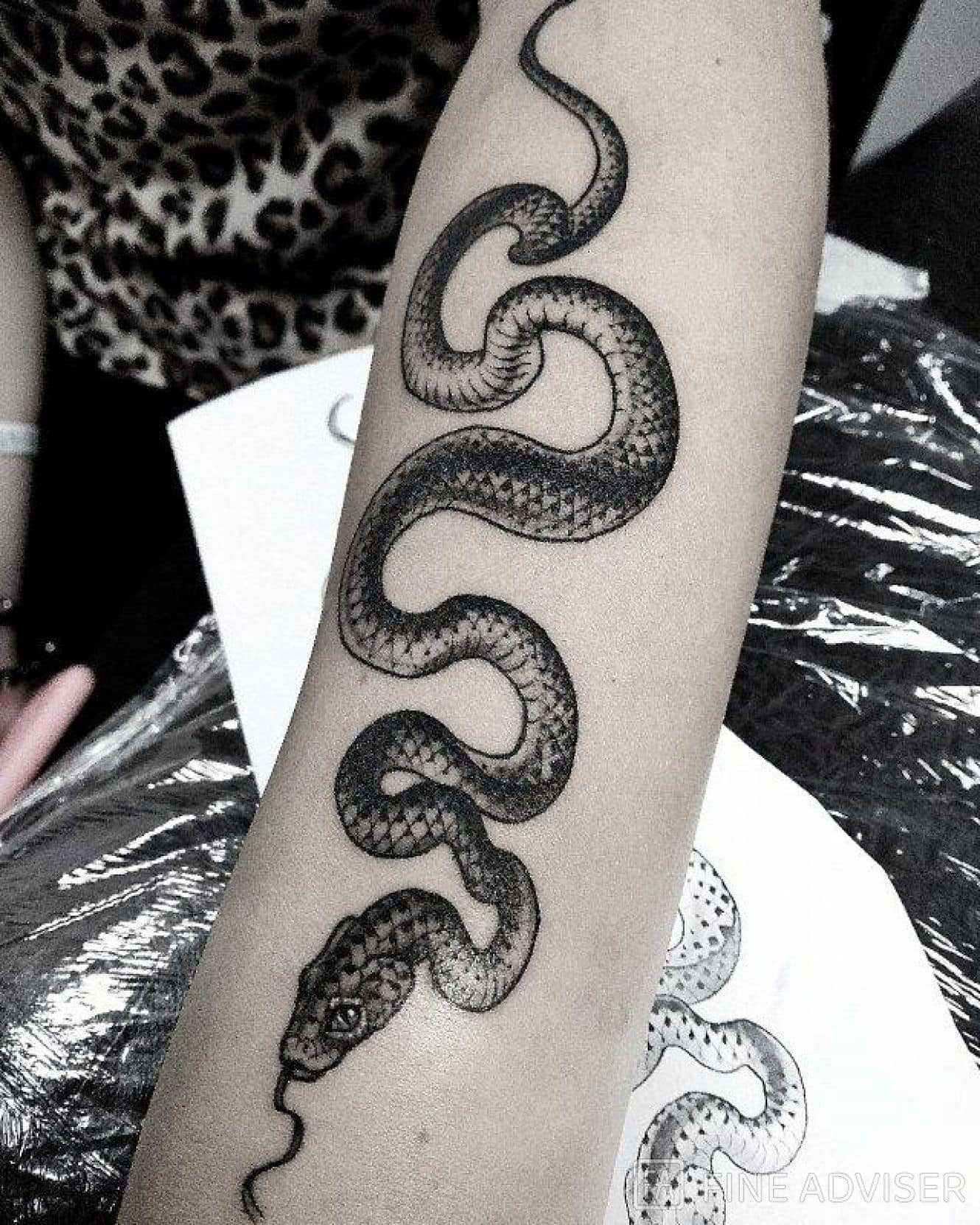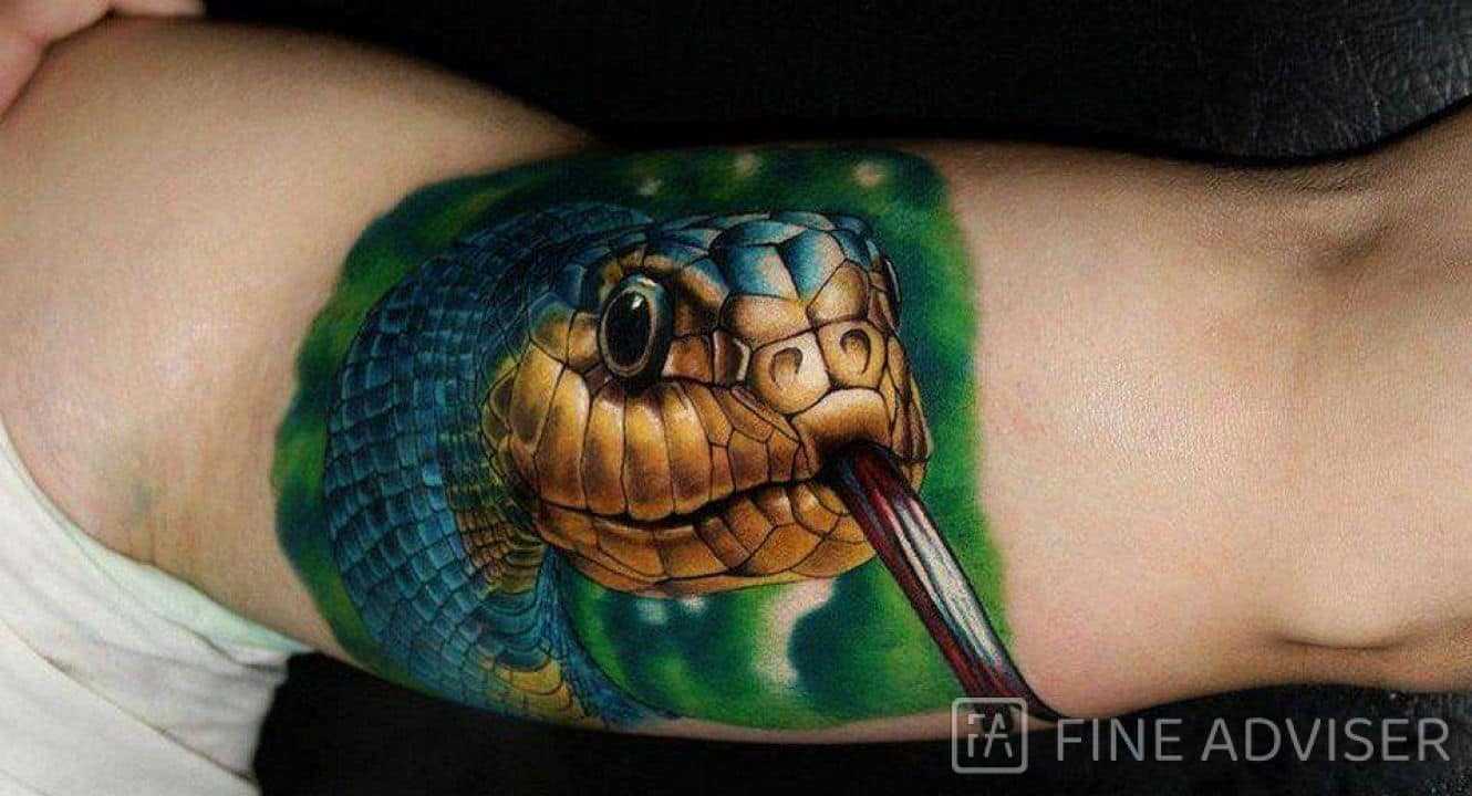 Впечатляюще смотрится татуировка пресмыкающегося на плече, груди, предплечье, когда змеиная голова прорывается сквозь кожу и словно вылазит из тела. Также можно запечатлеть хищницу, свернувшуюся в кольца.