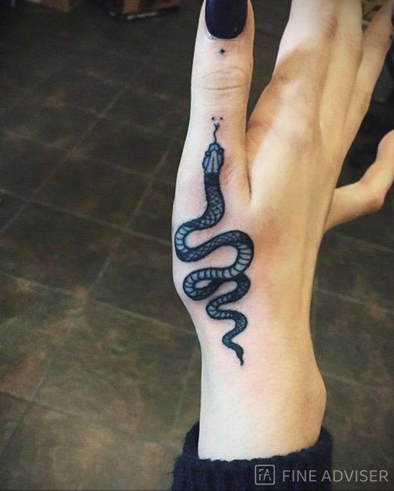 На пальцах набивают небольшую змейку, которая украсит изящные тонкие пальчики барышни и добавит ее образу определенный стиль. Не стоит делать тату на внутренней стороне, поскольку там располагается большое количество потовых желез и картинка быстро утратит свою привлекательность.