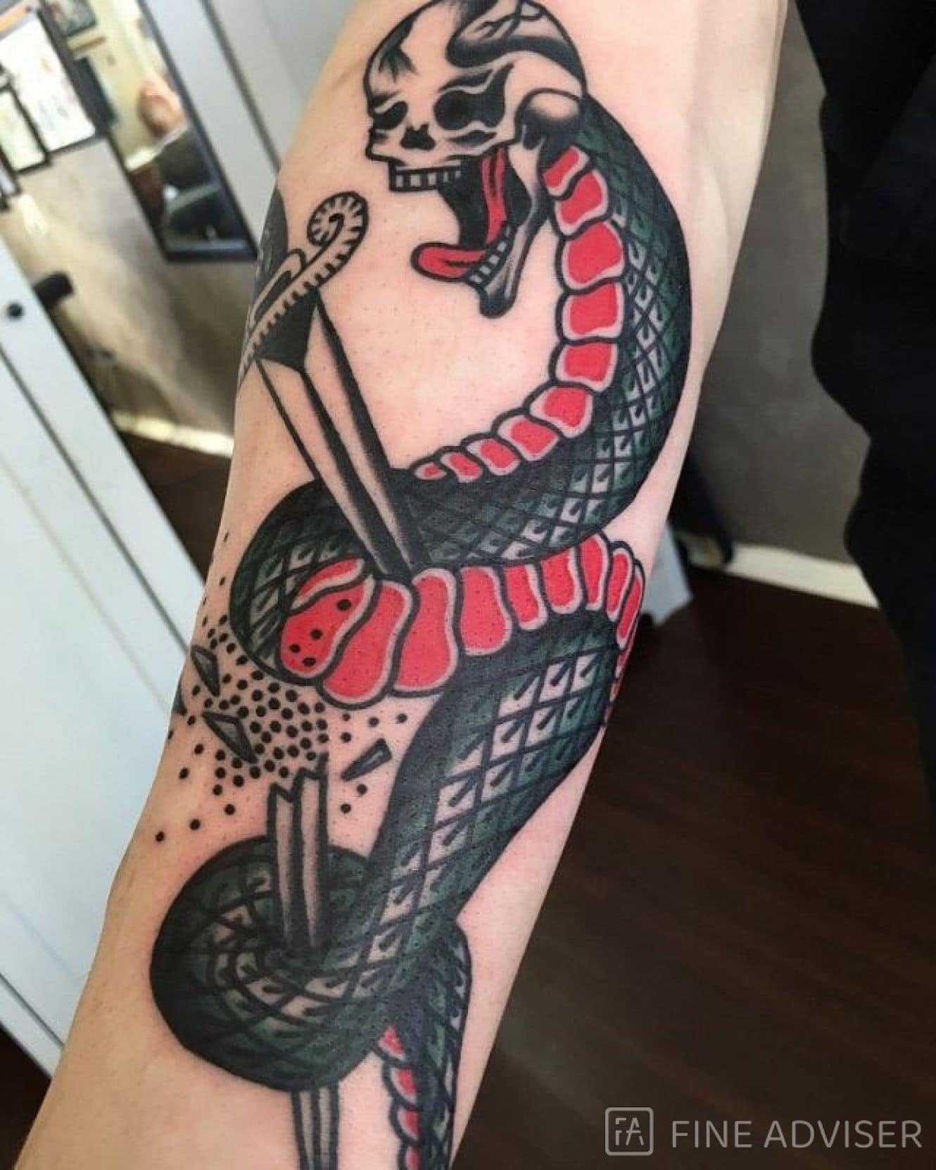 - Змея с кинжалом или мечом на руке. Холодное оружие свидетельствует о способности человека принимать решения молниеносно, а в сочетании со змеей такое тату – показатель того, что он готов справиться с любыми напастями и ударами судьбы. Для девушек чаще выбирается данный сюжет еще и с цветами, что дополнительно показывает женственность обладательницы. Для мужчин более свойственен сюжет только с кинжалом и змеей. В криминальном мире такая татуировка показывает ненависть ее хозяина к правоохранительным органам.