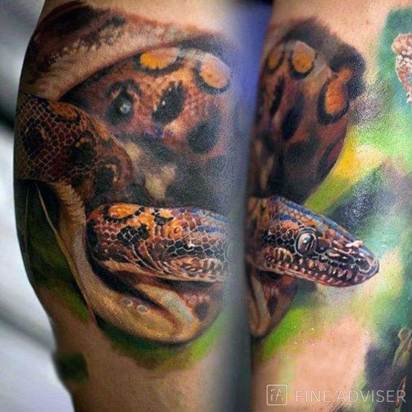 Тату змеи превосходно смотрится в более реалистичном виде, когда мастер прорисовывает каждую чешуйку. Оттенки бывают самые разные: зеленые, золотистые, красные, сероватые, оранжевые, монотонные.