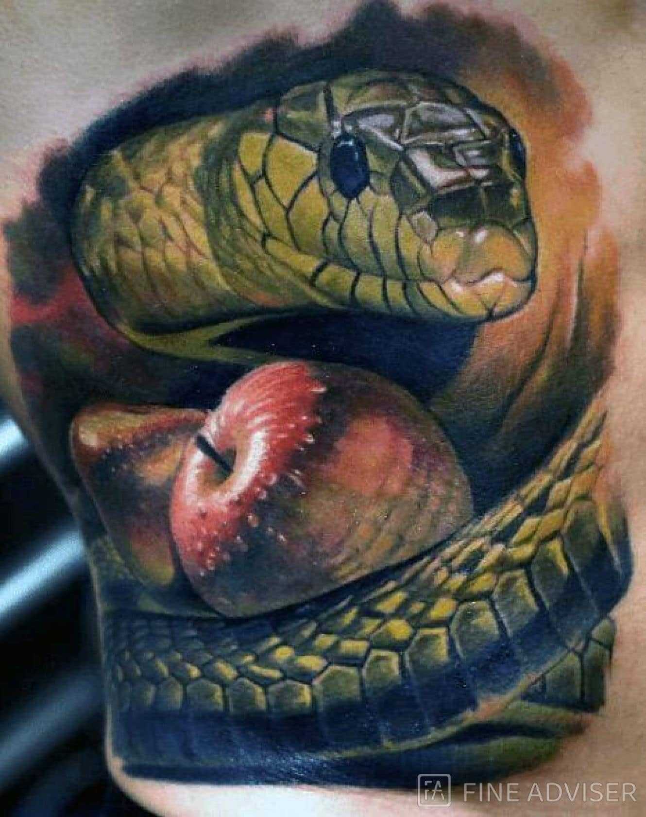 Стоит отметить, что первоначально змея, не смотря на свою агрессивность и опасность, в целом воспринималась, как положительный «персонаж». Однако уже после распространения христианства это существо стало оцениваться негативно – ведь в Библии рассказывается, что именно змей искусил Евы, после чего она и Адам были изгнаны из Эдемского сада. Хотя если говорить о том, какое значение имеет тату змей, именно библейская трактовка почти не встречается. Но давайте поговорим о том, как тату змея воспринималась в древности в разных культурах и верованиях. Выше мы вкратце рассмотрели это, но данная тема настолько обширна, что заслуживает отдельного внимания.