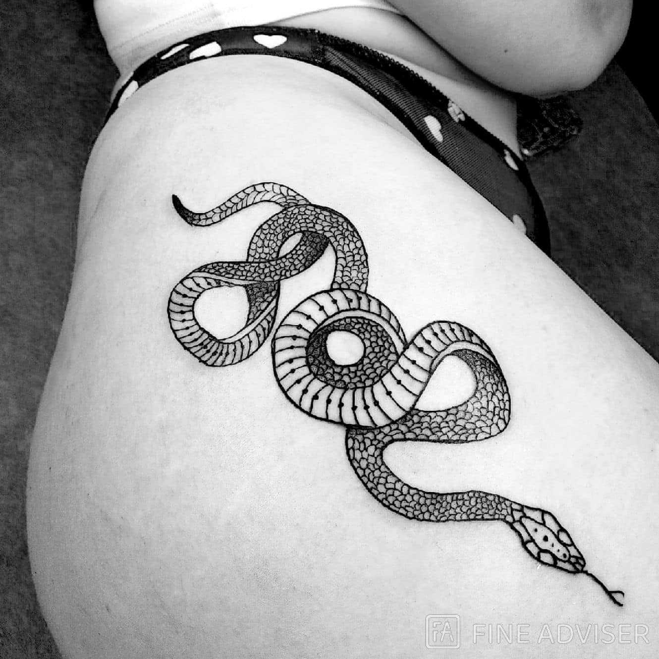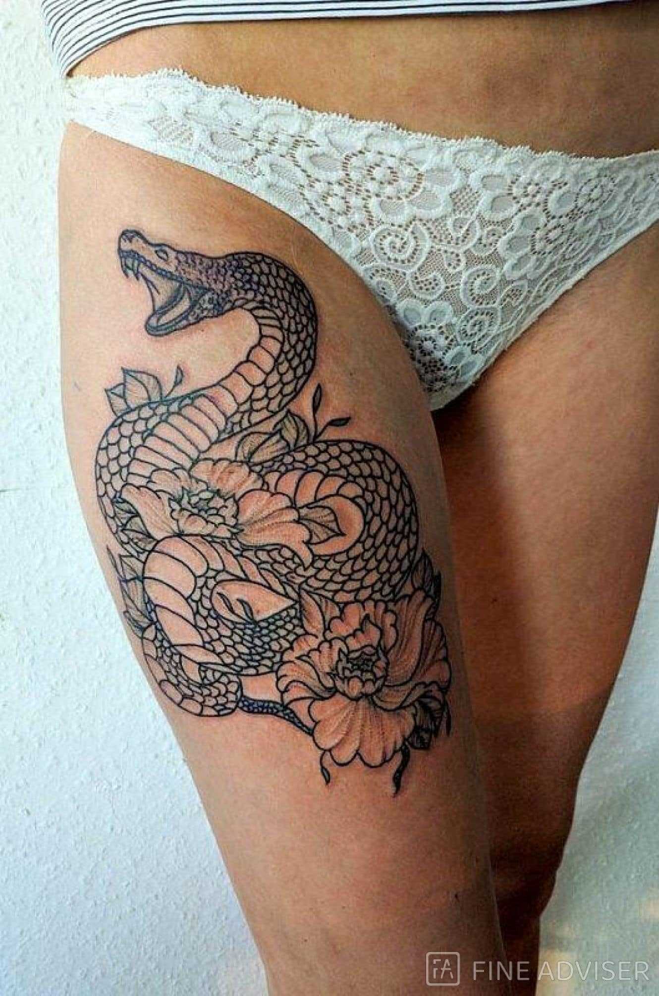 Кобра давно известна, как жестокая убийца и целительница одновременно. Значение тату кобры на женском бедре выражает плодородность, бессмертие и начало новой жизни.
