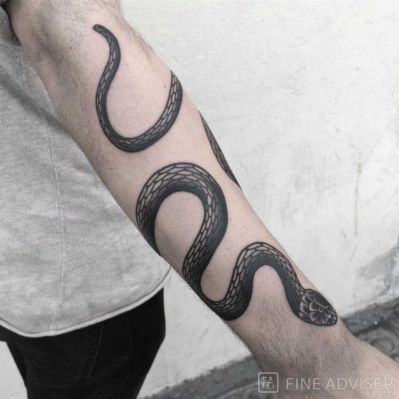 Тату змей, изображенный на теле в черном цвете, несет негативное значение, отражает отрицательные человеческие качества, пугает, символизируя зло, жестокость, подлость.