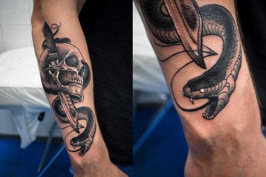 Татуировка в виде змеи, обвивающей меч, говорит о том, что жизнь – это вечная борьба. Меч – это символ битвы — внутренней или физической, или в любой метафорической форме он означает борьбу и сражение. Змея в татуировке символизирует постоянство или цикличность жизни. Сочетание этих двух символом означает жить, постоянно борясь. Вместо меча может быть изображен кинжал или нож.