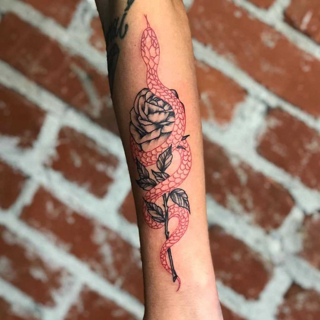 Роза является символом страсти, а рядом со змеей говорит об искушении, пылких чувствах, соблазне, именно поэтому многие предпочитают татуировку с этим цветком. Более точно значение трактуется зависимо от цвета розы. Белая говорит о невинности, красная — подчеркивает страстность характера. Человек, выбравший такое тату, может пытаться побороть какое-то искушение. В других случаях — наоборот, отразить и подчеркнуть пылкость натуры.