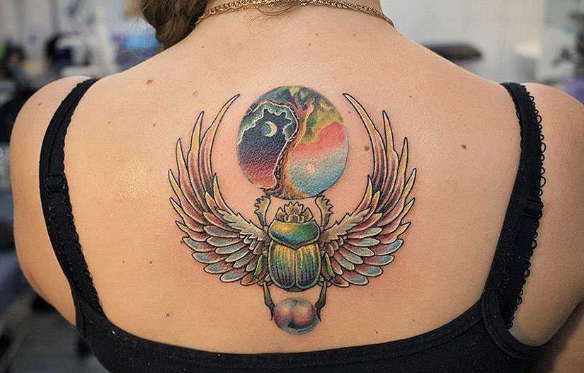 У тату со скарабеем довольно возвышенное значение, поэтому ассоциативно лучше наносить его на тело выше пояса. Хорошие места – плечи, спина, грудь, шея. Очень эффектно получится цветной жук с крыльями на всю спину. С другой стороны, как символ жизни и плодородия эскиз будет вполне уместен на животе, а также в паховой области, рядом с детородными органами.