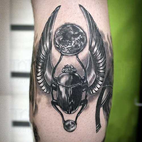 Существует также современный египетский стиль, где жука скарабея мастер изобразит объёмным. В этом случае тату делают чёрно-белым. Специалисты отмечают, что солнечный жук может стать началом и центральным символом рукава.