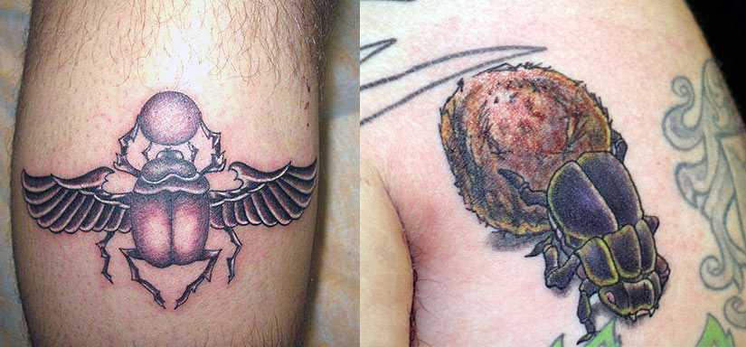 Жук скарабей, тату которого мастер может выполнить в любом стиле, станет оригинальным украшением на теле носителя. В большинстве случаев священное египетское насекомое изображают либо цветным, либо только чёрным контуром.
