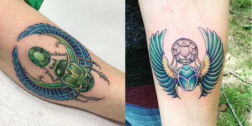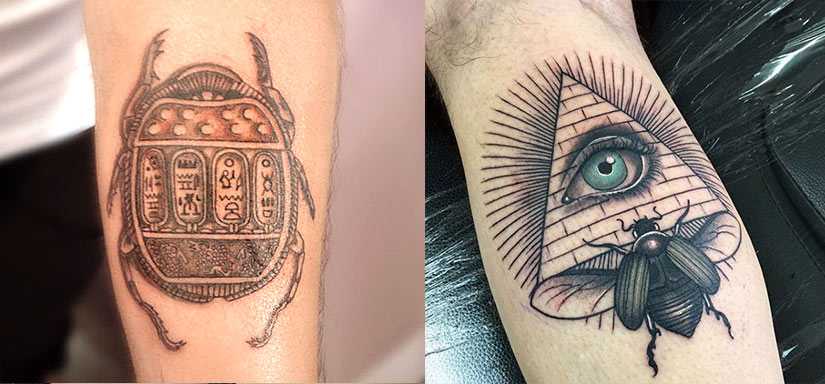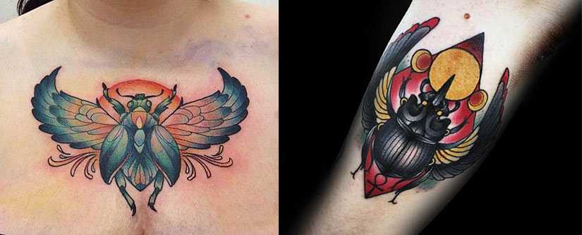 Скарабей – священный жук Египта. Его изображают на разных частях тела, заказывая классический рисунок или дополняя его необходимыми деталями, каждая из которых имеет собственное скрытое значение. Насекомое может лететь вверх, или спокойно сидеть на плече владельца. Кроме этого встречаются тату, когда солнечный жук ползёт с плеча вниз, в область груди.