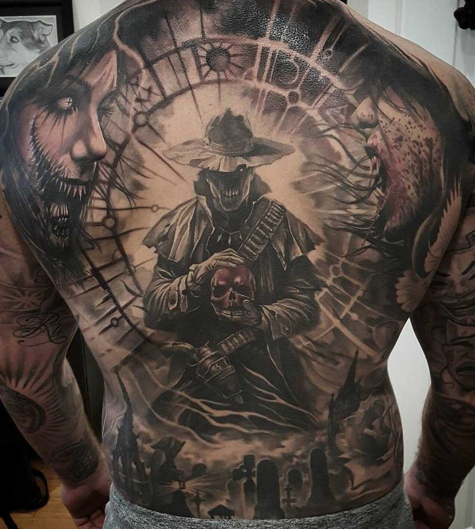 Спина самое большое место для татуировки. На спину обычно наносят целые сюжетные картины, военные баталии или просто крупное изображение чего-либо. Из-за ровной поверхности спина удобнее всего для нанесения татуировки.