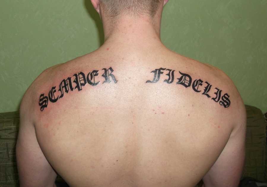 - Спина становится настоящей доской для татуировок. Среди преимуществ татуированные выделяют слабые болевые ощущения и простую возможность скрыть надпись. Зона подходит для наколки длинных и крупных фраз.