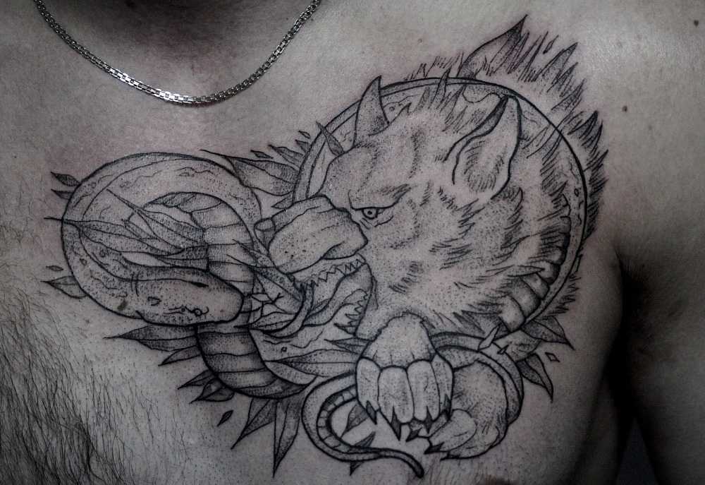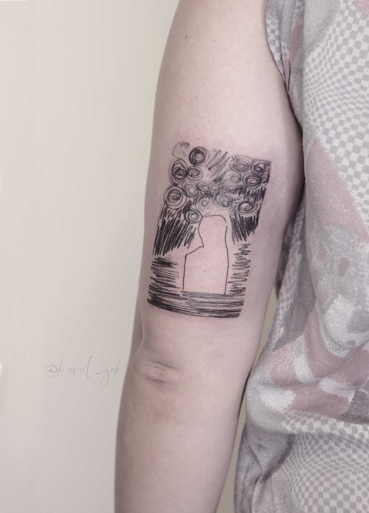 - Монохромность – одна из самых важных особенностей стиля графика. При выполнении татуировки чаще всего применяется черный цвет, очень редко татуировки наносятся в цветном решении.