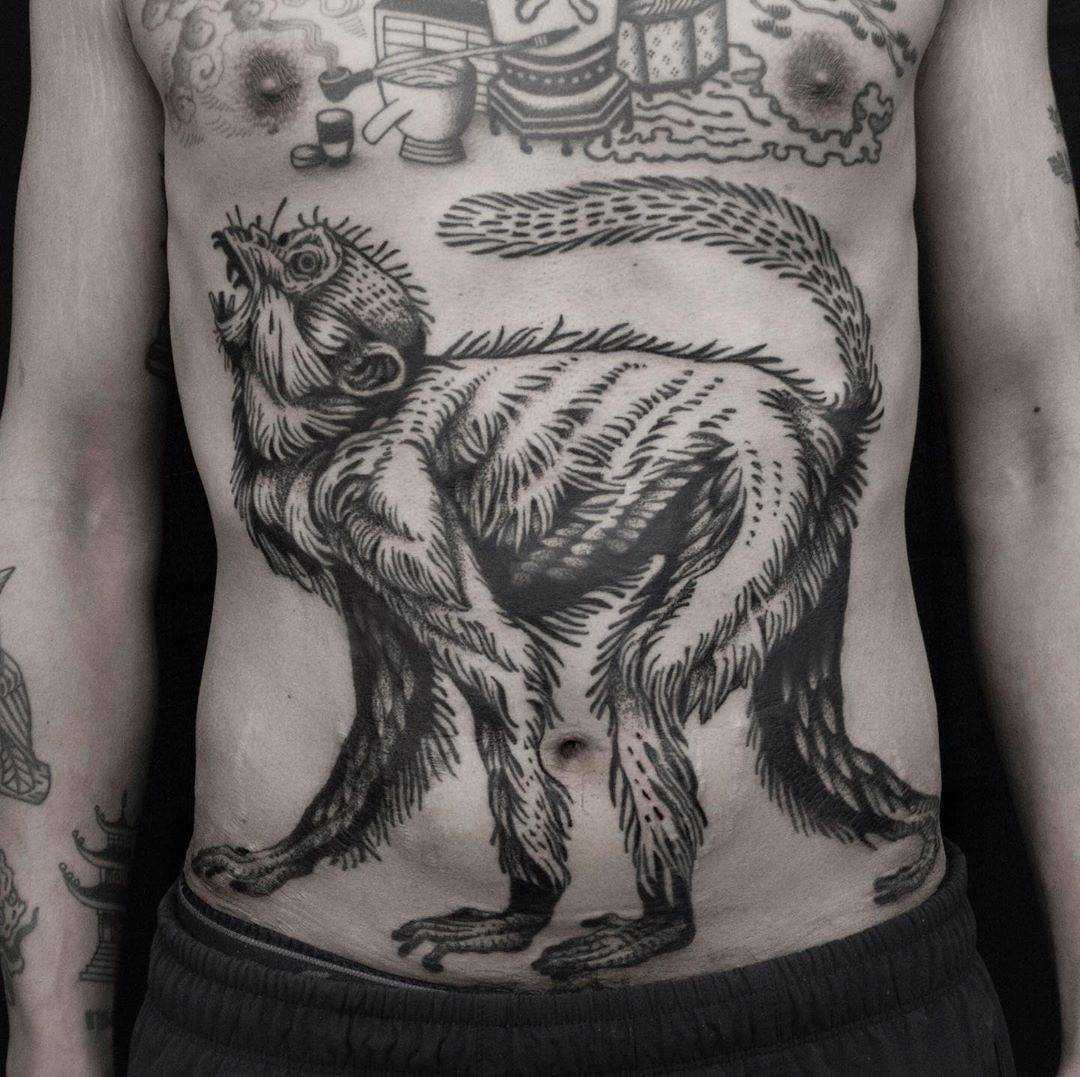 Иван Вишневский надписи на животе блэк ворк мужчина черно-белая