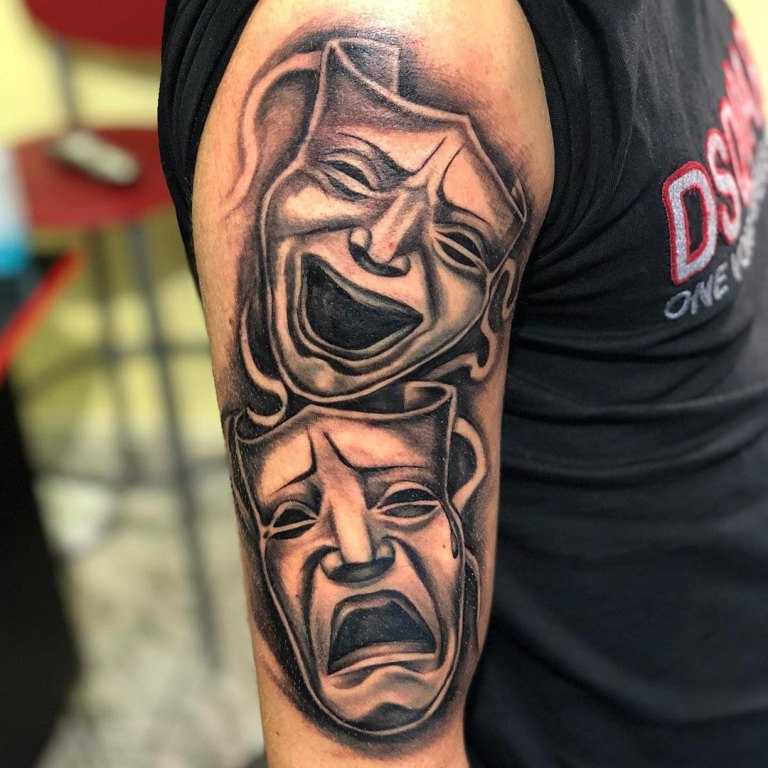 В масках, которые изображали различные эмоции, выступали актеры еще на подмостках театров Древнего Рима. В качестве тату обычно изображают две маски, которые означают противоположные эмоции, качества характера или явления. Например, черное и белое, грусть и радость, добро и зло, любовь и ненависть.