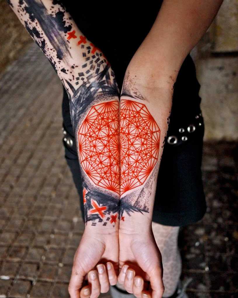 Неизбитым решением для тату на предплечье является раздельная татуировка: где две части одного рисунка или фразы наносятся на обе руки.