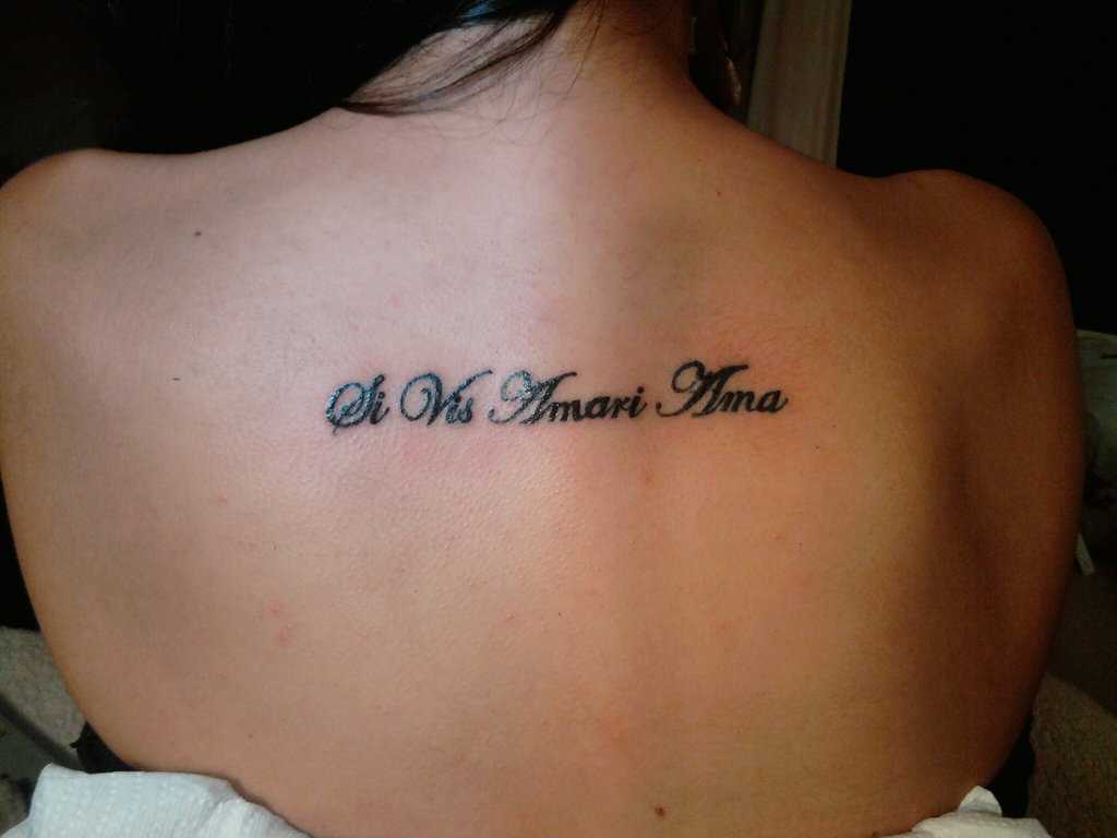 Надписи – это самые популярные эскизы татуировок не только на спине, но и на других частях тела. На сегодняшний день разработано множество шрифтов, при помощи которых можно превратить значимый для женщины текст в красивую тату, обладающую с глубоким смыслом. Помимо стиля шрифта, необходимо определиться с выбором языка, на котором фраза будет выглядеть и звучать наиболее удачно.