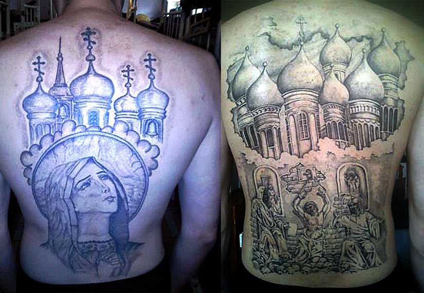 Многим также интересны тюремные татуировки на спине и их значение. Говоря о них, первая ассоциация, которая возникает в голове – это купола на всю спину. Считается, что данный сюжет символизирует количество ходок на зону. Количество куполов напрямую связано с количеством лет, которые заключенный провел в тюрьме. Если купола украшены крестами, это значит, что заключенный отсидел за содеянное преступление весь положенный срок.