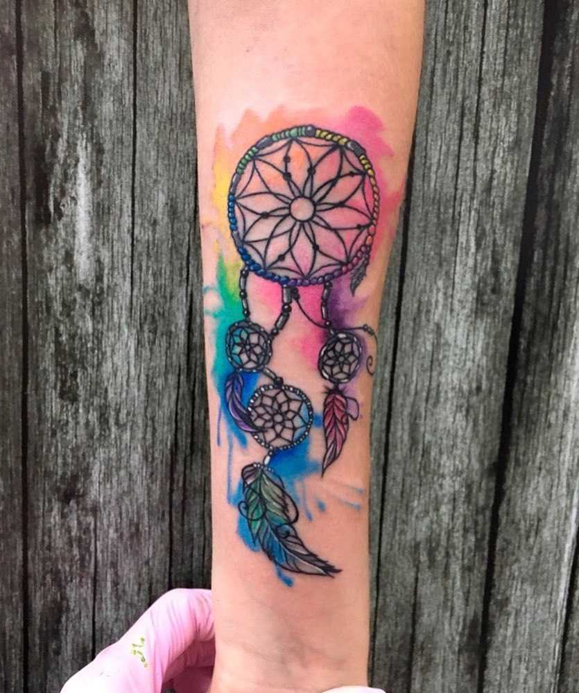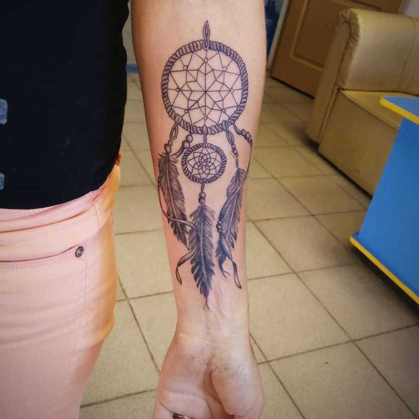 Это красивые мотивы для женских татуировок, которые часто изображаются с бисером и перьями. Этой татуировке на руке для девушек приписывают функции, связанные с улавливанием негативных энергий и кошмарных снов.