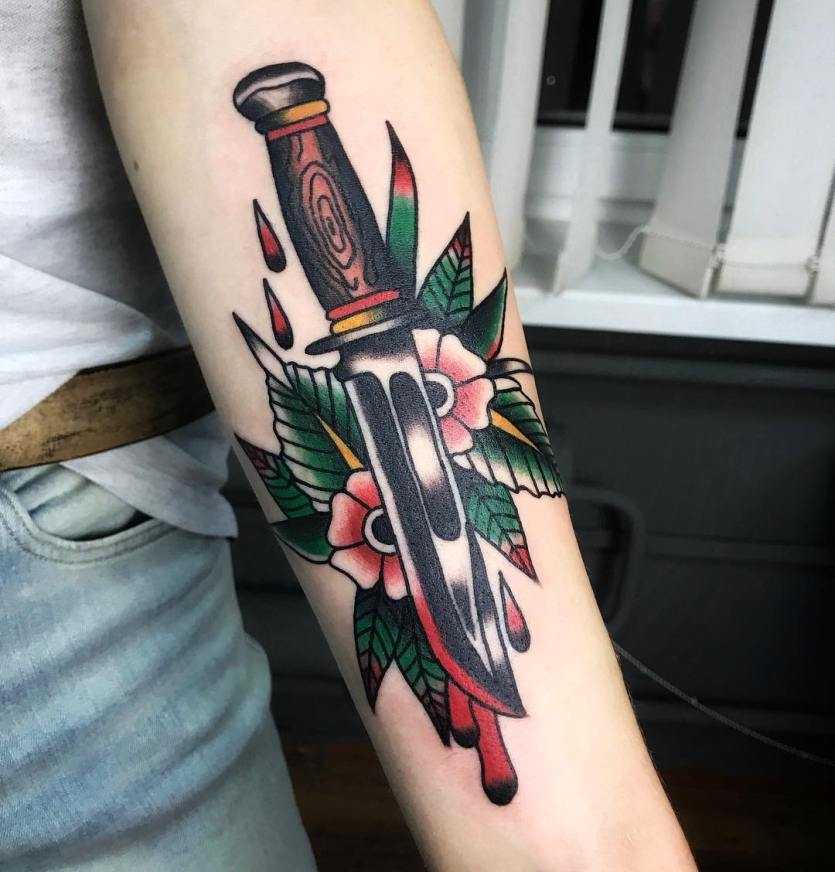 Рисунки в этом стиле имеют характерные для них толстые контуры и насыщенный окрас. Часто цветные тату на руке для девушек соединяются в единый мотив, представляющий собой «рукав».