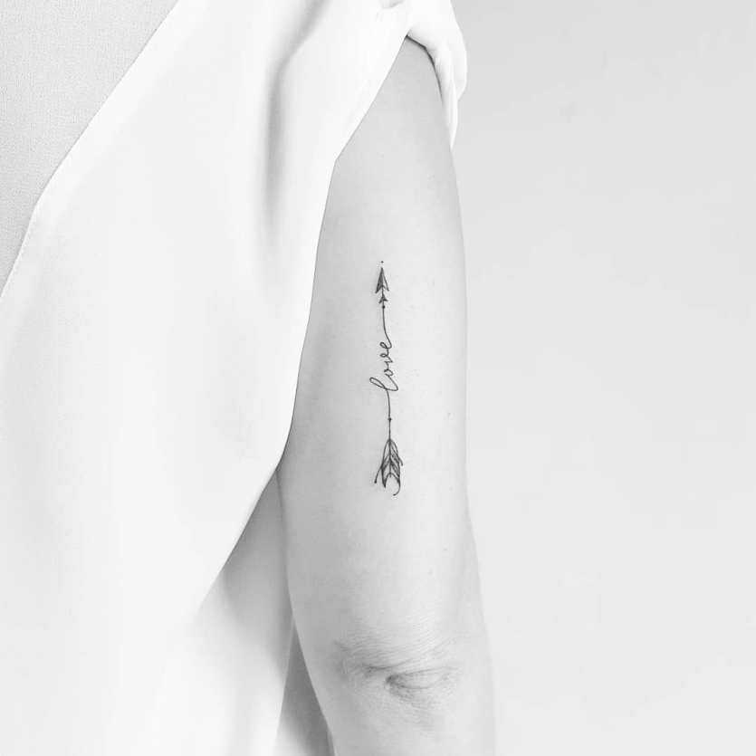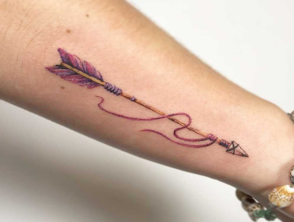 Женские татуировки на руке в виде стрелы символизирует изящество и элегантность. Наиболее привлекательно выглядит дизайн среднего размера, размещенный на предплечье.