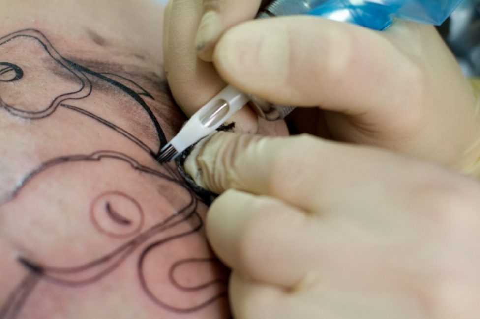 Мастер наносит контур татуировки, смазывая кожу вазелином. Это необходимо, чтобы кожа клиента не так раздражалась в процессе постоянного вытирания излишек краски.